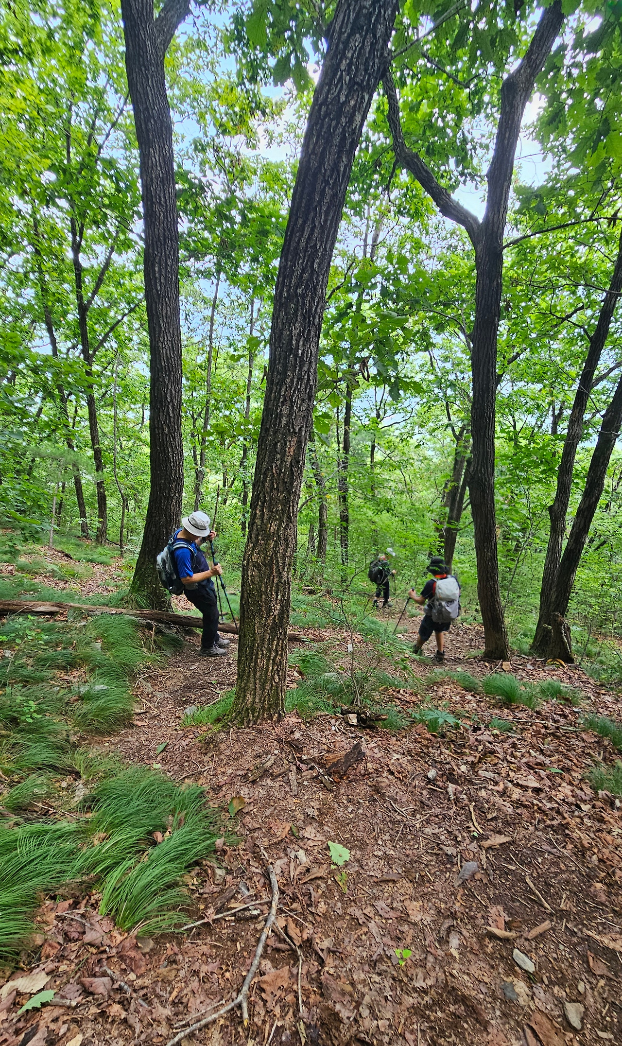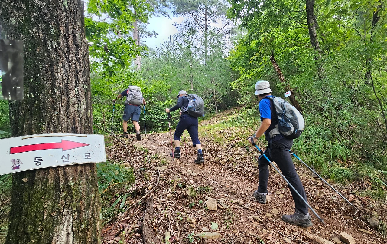 고도가 높아서인지 본격적인 산행 전이라 그런지 들머리 부근 공기는 더위가 멀찍이 물러나 있는 듯 선선함이 느껴진다. 그런 느낌도 잠시뿐 들머리부터 곧추 고도를 높여 가는 등로는 차츰 호흡을 가쁘게 하고, 손은 금세 얼굴로 흘러내리는 땀을 연신 훔쳐내기에 바쁘다. 쭉쭉 뻗은 성긴 참나무와 소나무 숲은 안개에 잠겨있지만, 등산화가 미끄러지지 않고 찰진 느낌이 드는 흙길 등로가 기분을 차분히 해준다.