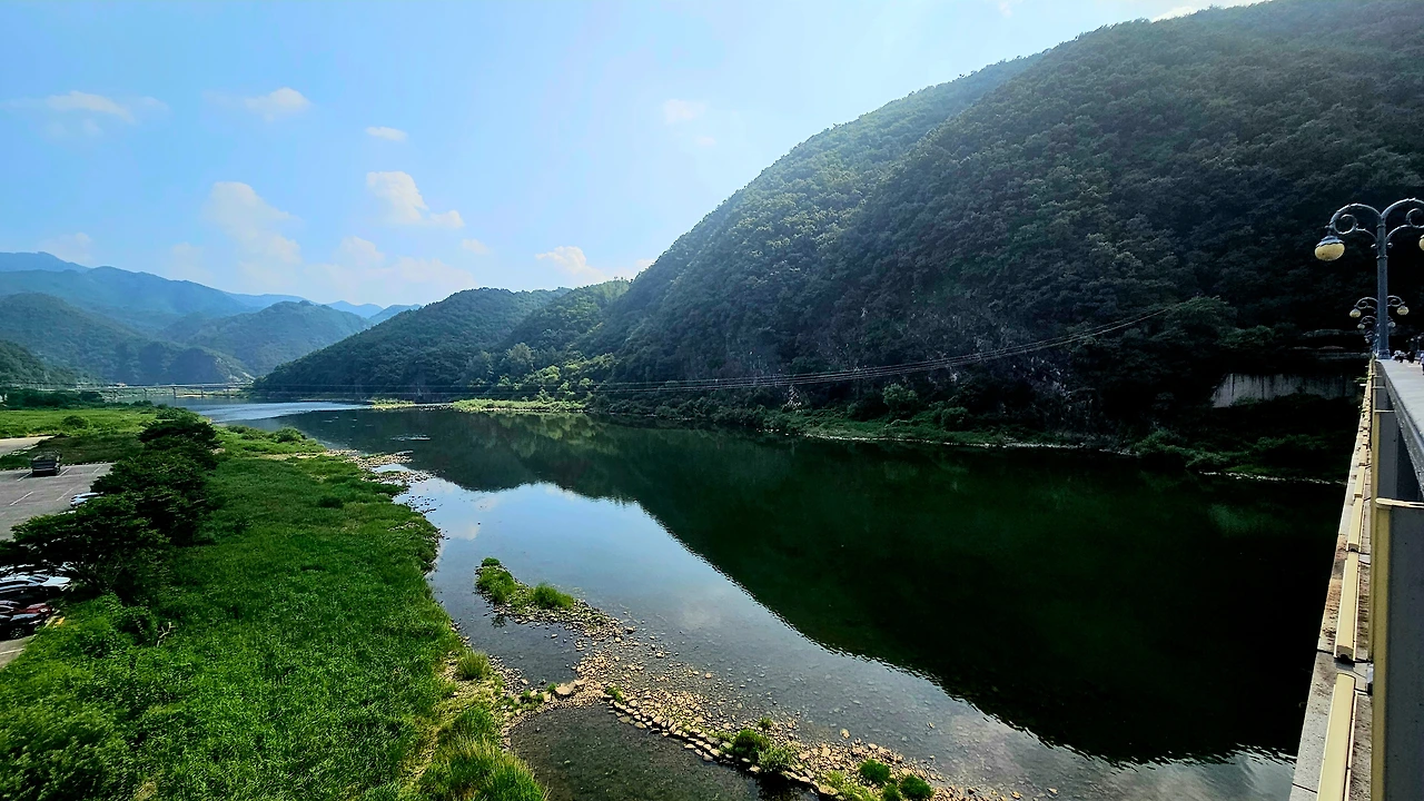 고씨동굴 입구 날머리로 내려서기 전에 등로는 산행 내내 전망다운 전망을 한 번도 제대로 보지 못한 산객의 아쉬움을 조금이라도 달래주려는 듯 전망 데크 하나를 내놓는다. 전망대는 그 아래에 남한강 줄기, 강 건너 고씨굴 매표소와 고씨굴을 잇는 인도교 등을 나뭇가지 사이로 펼쳐 놓았다.