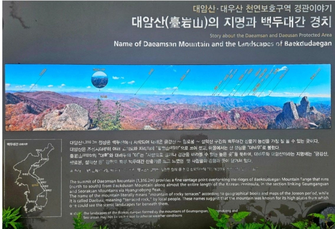 궂은 날씨로 금강산 능선 일부를 직접 눈으로 확인할 수 있는 기회를 턱밑에서 놓쳐버린 아쉬움을 등로 한편에 세워놓은 '대암산(臺岩山)의 지명과 백두대간 경치'라는 표제의 조감도로 달래 본다. 조감도는 펀치볼 지구 너머 금강산 지구로부터 시작하여 삼치령, 향로봉, 신선봉, 황철봉, 공룡능선, 대청봉, 한계령, 가리산으로 장성처럼 장대하게 이어진 능선을 길게 펼쳐 놓았다.