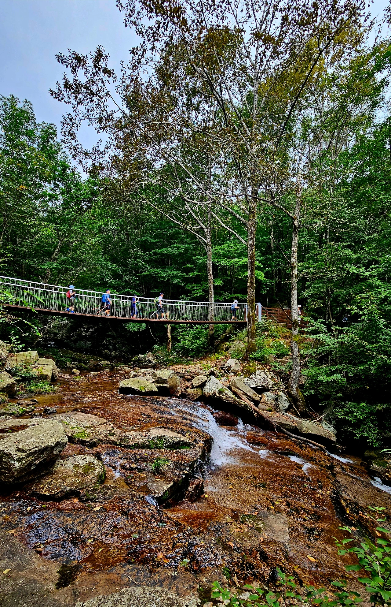시원한 소리에 기운찬 물줄기가 내려가는 계곡 위로 놓인 아치교를 건너 용늪을 향해 산비탈을 치고 오르기 시작했다. 한 줄로 서서 산길을 오르는 탐방객 행렬은 스틱 대신 소총만 들려주면 1개 분대 병력이 행군하는 모습과 진배없이 닮았다.