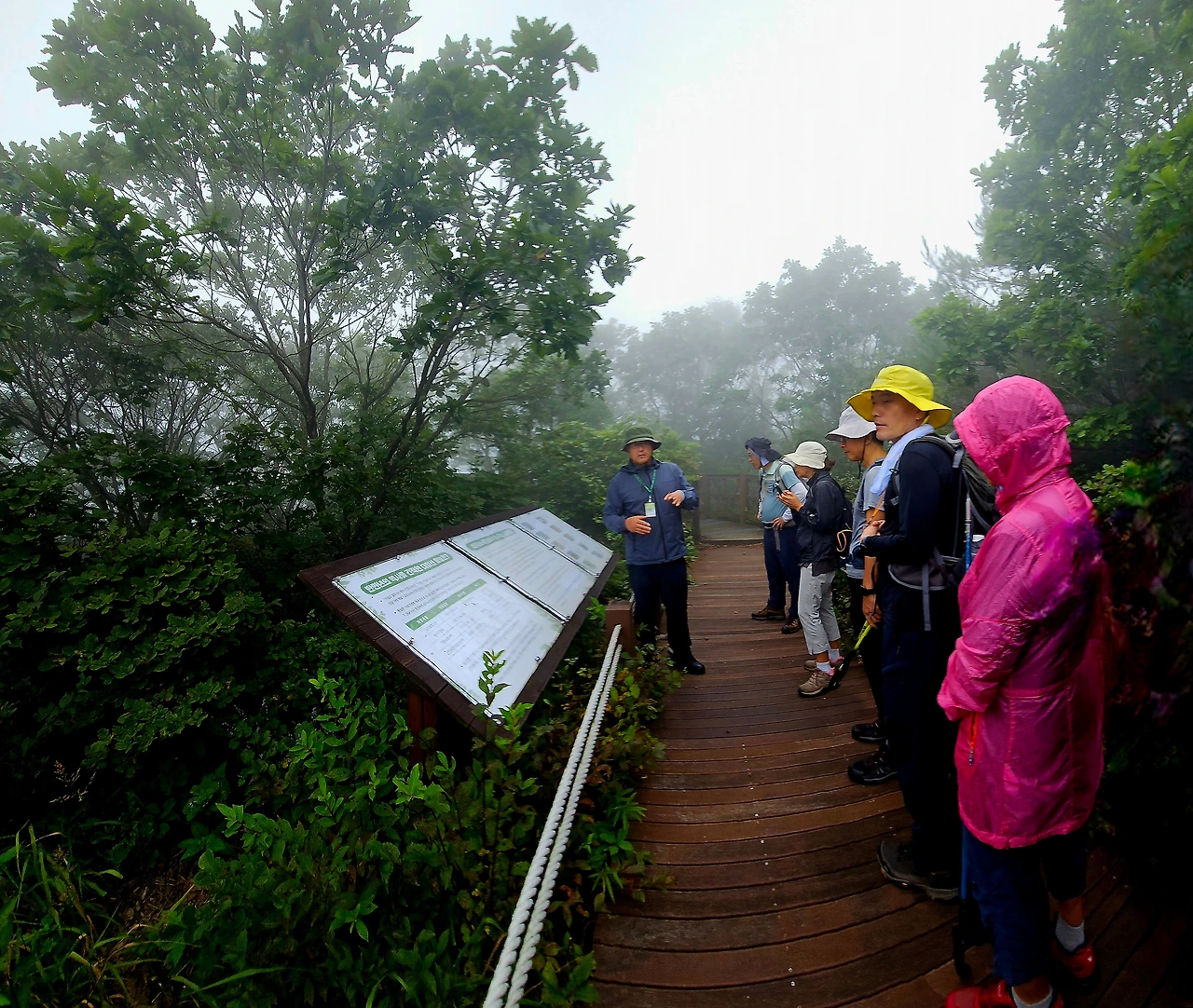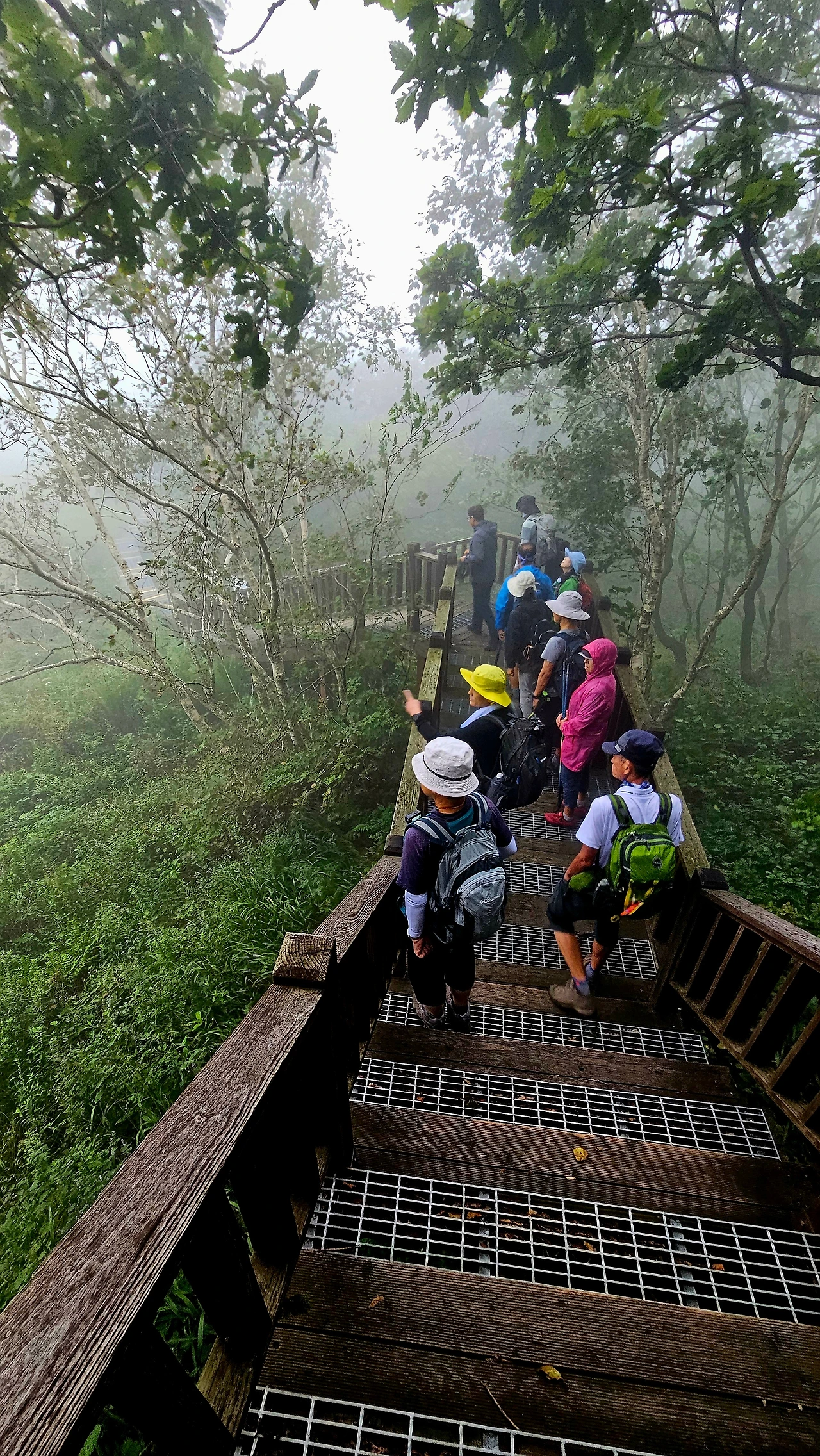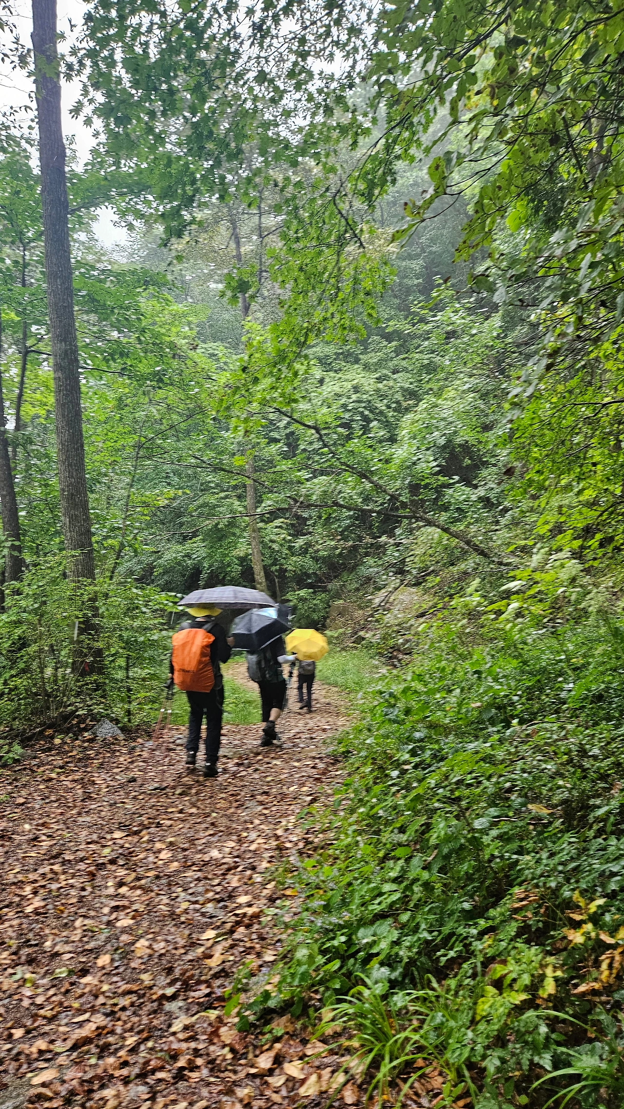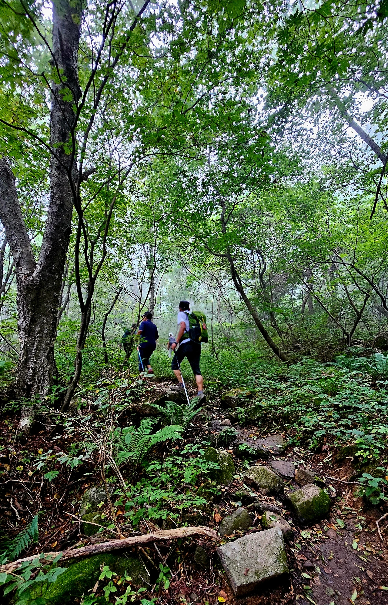 가이드의 통제에서 풀려난 탐방안내소까지 4km의 하산길이 기다리고 있다. 나는 산을 오를 때와는 달리 다른 탐방객에 앞서 동행한 친구들과 함께 제일 앞서 외길 등로를 따라 발길을 재촉했다. 무게를 주체하지 못한 운무는 굵은 빗줄기로 변하여 나뭇잎과 등로와 우의와 우산 위에 뚝뚝 소리를 내며 떨어진다. 온 숲과 숲을 감싼 공기도 안개와 비에 축축이 젖었다.