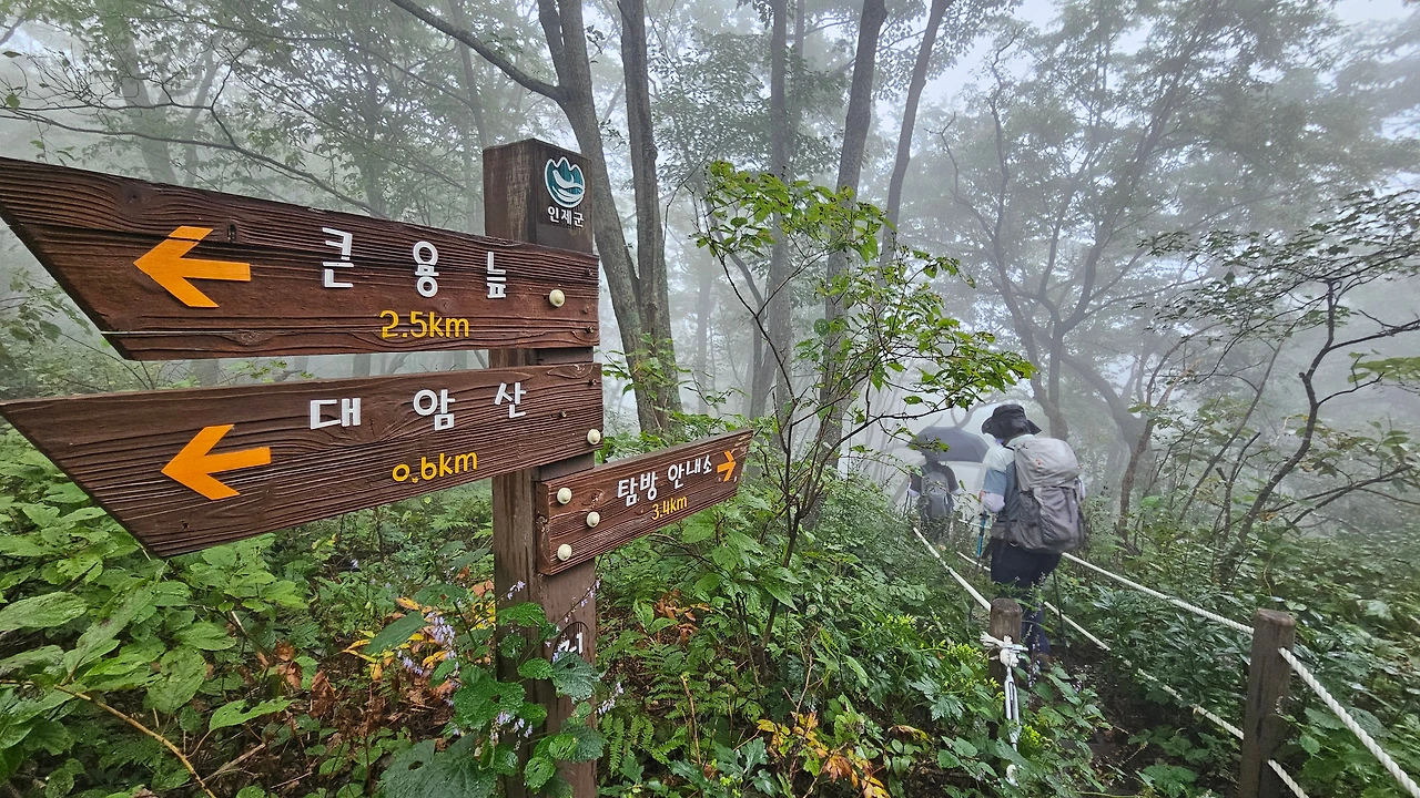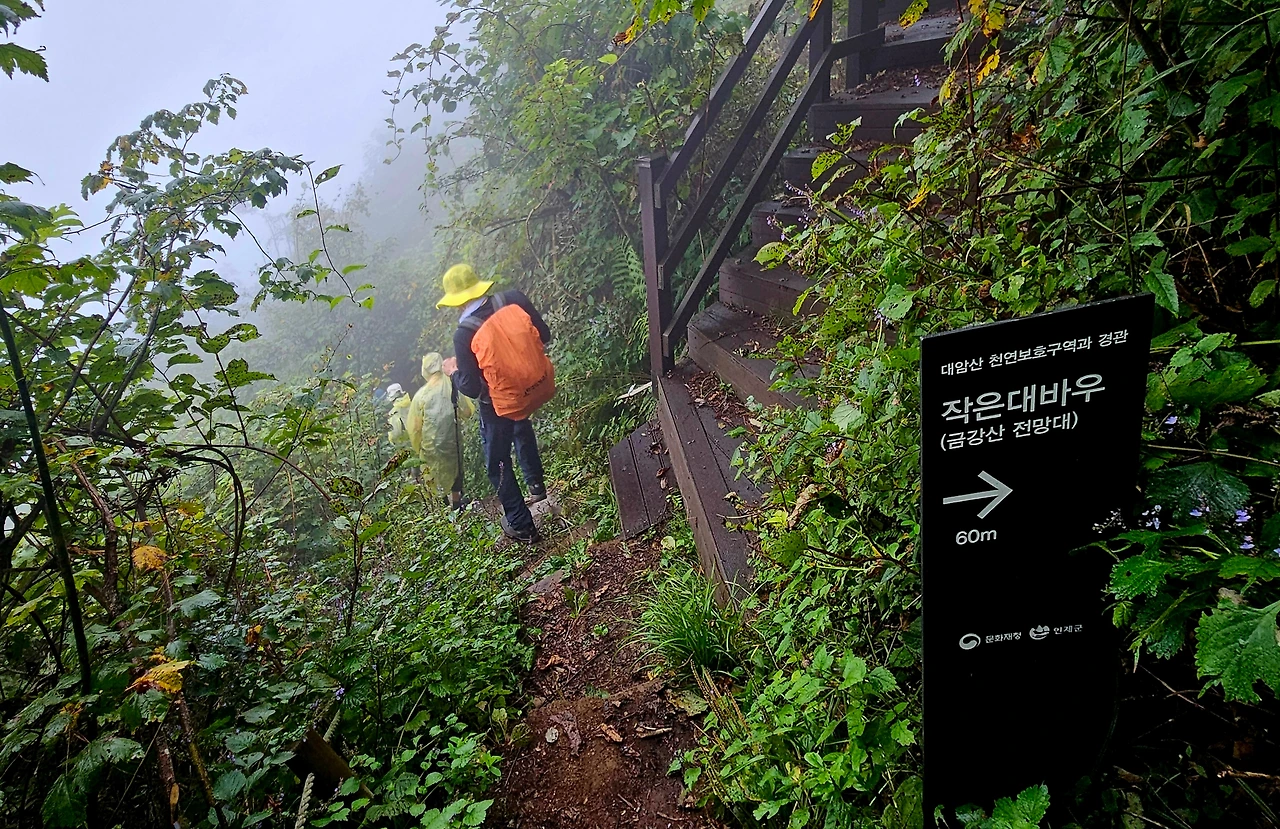 용늪 탐방 데크를 빠져나오자 관리소 쪽에서 기다리고 있던 가이드 김 여사가 다시 우리 일행을 인솔하여 1.5km 거리 대암산 정상 쪽으로 향했다. 등로는 용늪으로 올라올 때보다 더 거칠고 험하다. 걸음을 옮길 때마다 등로 옆으로 철조망과 함께 '지뢰', '출입금지', '미확인 지뢰지대' 등의 글귀가 적힌 푯말이 군데군데 시야를 스쳐 지난다. 이어서 눈에 띄는 '작은 대바우(금강산 전망대) 50m'라고 적힌 이정표가 반갑기 그지없지만, "비에 젖어 위험하고 안개가 시야를 가렸으니 그냥 지나치자."는 가이드의 말을 거스를 명분이 없다.