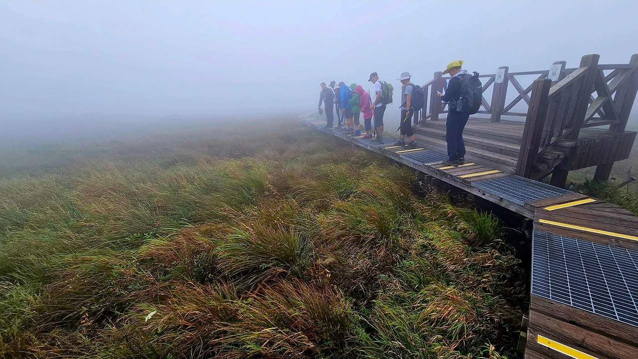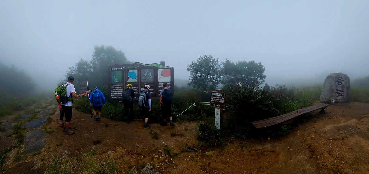 대암산의 9부 능선 해발 1,280m 용늪 표지석이 있는 공터에서 탐방 가이드가 중년의 지방환경청 소속 자연환경 해설사에게 우리 일행을 인계하고 자신은 용늪 반대편 용늪 관리소에서 우리를 기다리겠다며 안갯속으로 사라져 갔다.
