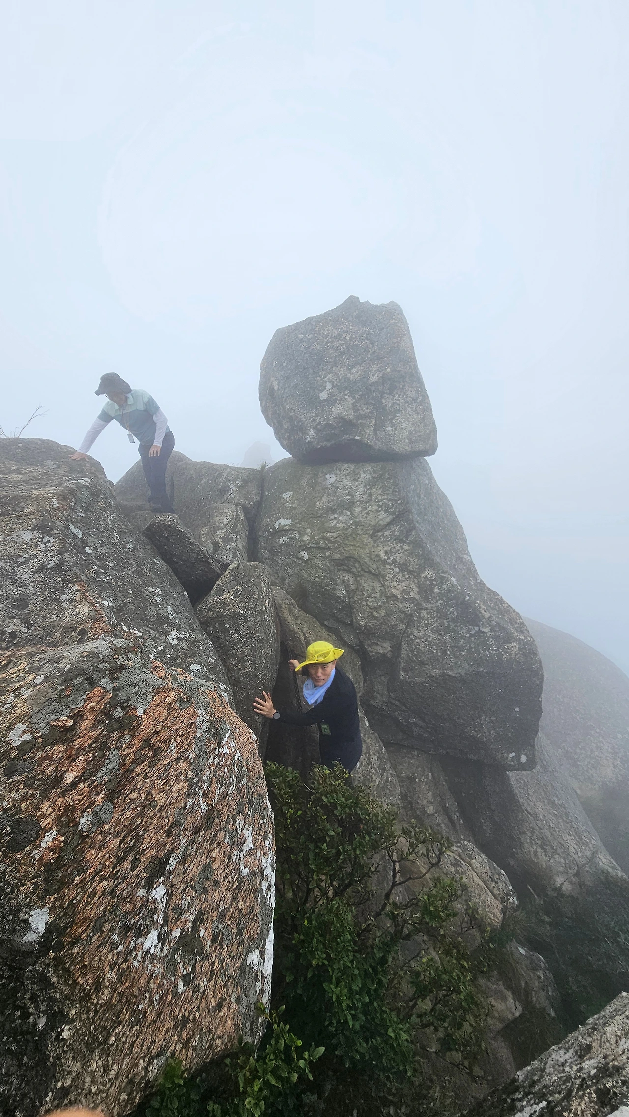 어느덧 거대한 바위가 서로 엉기며 우뚝하게 솟아오른 대암산 정상 턱밑에 닿자, 가이드는 산객들에게 각별히 조심하라고 당부하며 산정에 다녀오라고 한다. 층층 쌓이고 서로 엉겨 붙은 바윗길 등로에 암벽등반 하듯 엉겨 붙어 5분 남짓 씨름하며 정상 바위로 올라섰다. 안갯속으로 끝을 알 수 없는 급전직하 절벽에서 거센 안개 바람이 산정으로 휘몰아쳐서 몸을 가누기조차 쉽지 않다. 탐방객 중 대부분은 정상 표지판까지 오르는 것을 포기하고 발길을 돌렸지만, 우리 일행은 바윗돌에 붙박이처럼 붙어 있는 '대암산 312m'라고 적힌 40×20cm 크기 철제 표지판에서 인증 사진을 남기고 서둘러 발길을 옮긴다.