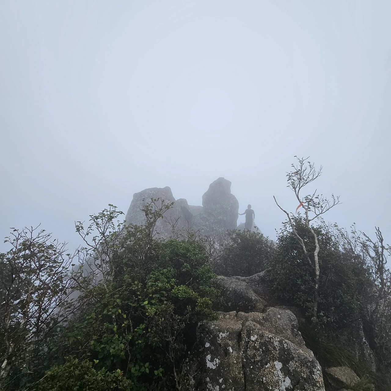 숲을 바람에 성난 파도처럼 이리저리 흔들리고, 날 선 공룡의 등처럼 이어진 능선 위 등로로 바람이 휘몰아칠 때마다 나무 잎새에 맺힌 물기가 후드득후드득 몸으로 떨어진다. 산객들은 배낭에 커버를 씌우고 우비를 꺼내 입고 산정으로 발길을 재촉한다.