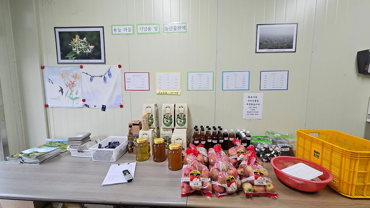 지원센터 1층에는 마을 주민들이 직접 생산한 것이라는 각종 담금주, 사과, 고사리, 버섯, 기념 뱃지와 손수건 수수한 등이 탁자 위에 놓여 있다. 포장이나 꾸임 없이 놓여 있는 수수한 물품 중에서 제비동자꽃이 그려진 손수건을 하나씩 집어 들었다. 탐방 가이드에 이어 탐방 예약자들이 하나둘 차례로 도착했다. 탐방 가이드는 마을 주민 10명이 돌아가며 맡는다고 한다. 통상 용늪과 대암산 탐방객 수는 주말에는 3차례 총 100여 명, 평일에는 오늘처럼 10명 남짓으로 한두 차례라고 귀띔한다.
