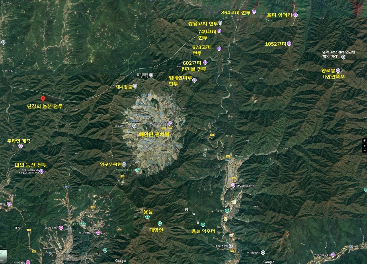 해발 1,000미터 고봉들로 둘러싸인 양구군 해안면(亥安面)은 6.25 전쟁 당시 UN군이 그 모습이 화채 그릇(Punch Bowl)처럼 생겼다고 하여 '펀치볼(Punch Bowl)'이라 불렸는데, 그 일대는 1951년 8월 말부터 10월 중순까지 펀치볼 전투, 도솔산 전투, 가칠봉 전투 등 6.25 전쟁의 치열한 격전지였다. 구글 맵에는 국내 지도 앱에는 나타나지 않는 피의 능선 전투 격전지, 단장의 능선 전투 격전지 602 고지 673 고지 854 고지 등 펀치볼 전투 격전지 등과 제4 땅굴, 가칠봉 을지전망대 등의 위치를 상세히 검색할 수 있다.
