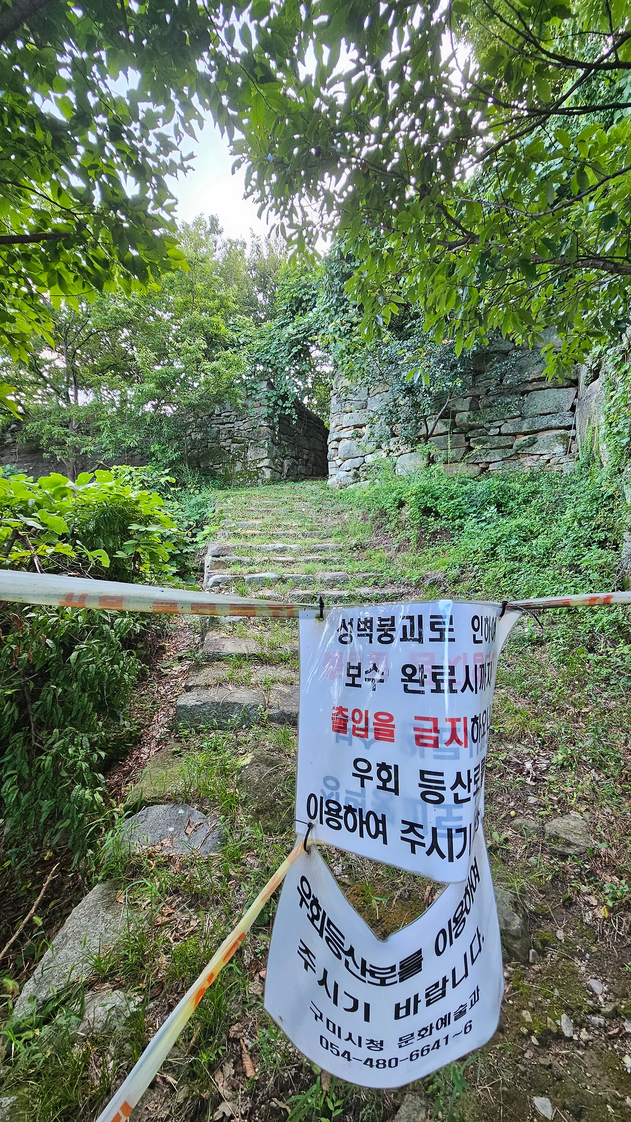 나무 계단을 내려서니 그 우측에 자연석으로 쌓은 2~3m 높이 천생산성의 북문이 38선 탱크 방어벽처럼 견고하게 비탈에 비켜 자리하고 있다. 성문 아래쪽에 붕괴된 성벽 보수공사로 인해 출입을 통제한다는 표지가 가로막고 있어 아쉽다. 산성 정상부에서 시작된 가파른 비탈은 북문에서 가지런히 놓인 돌계단을 한참 더 내려와야 멎으며 평탄해진다.