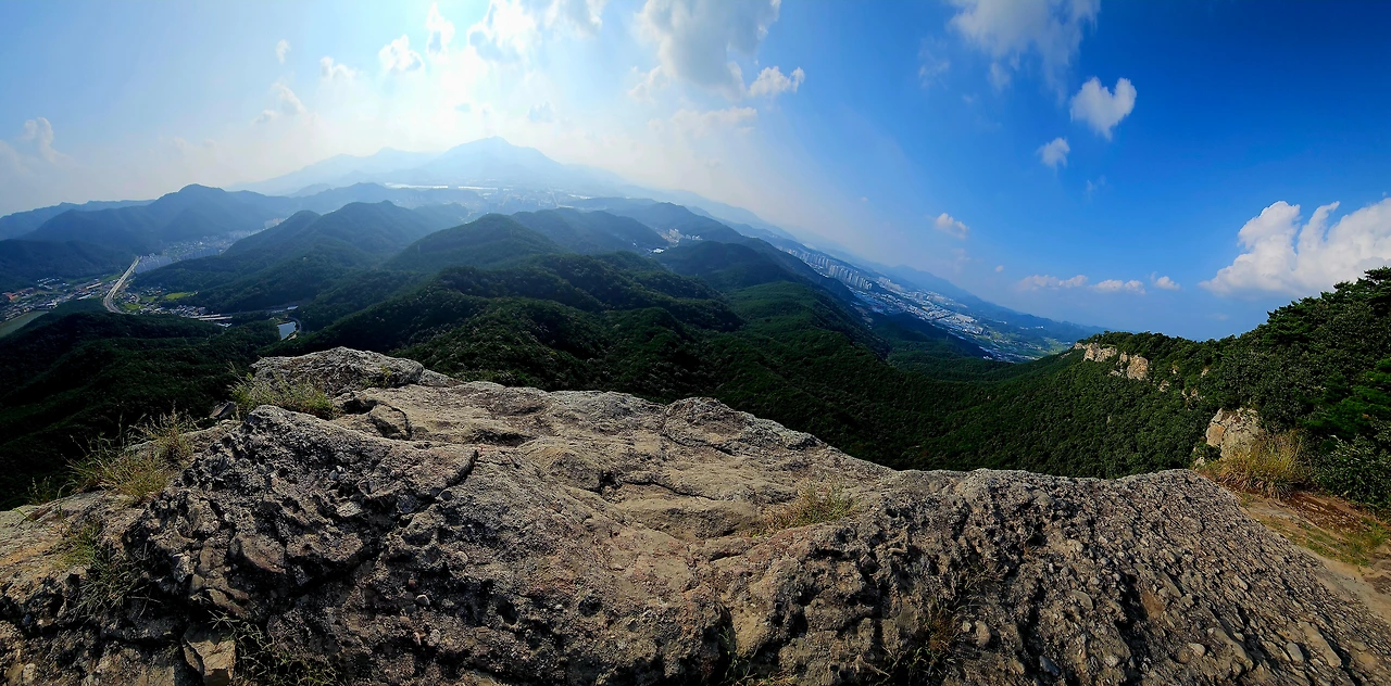 오후 세 시경 산성지에서 등로로 들어서서 천생산 정상으로 향했다. 천생산 정상까지는 1.5km로 여러 코스 가운데 가장 단거리 코스로 알려져 있다. 등로 초입은 완만한 경사의 계곡 주변에 미소년처럼 곧게 뻗은 수려한 적송 군락 사이로 난 호젓한 길이다. 계곡 만곡부 노송 아래 정자에는 피서객 두 명이 마주 앉아 정담을 나누고 있다.