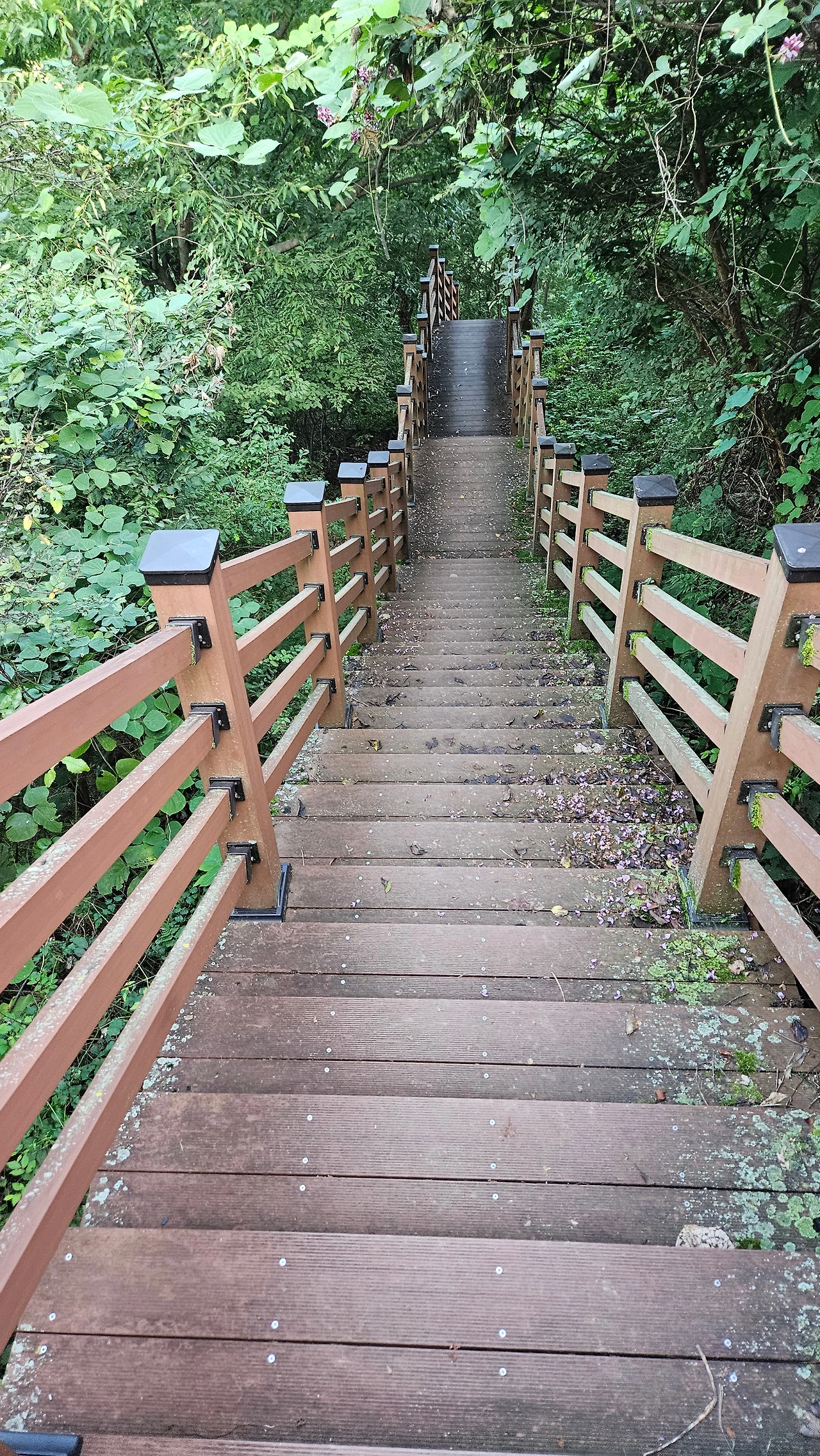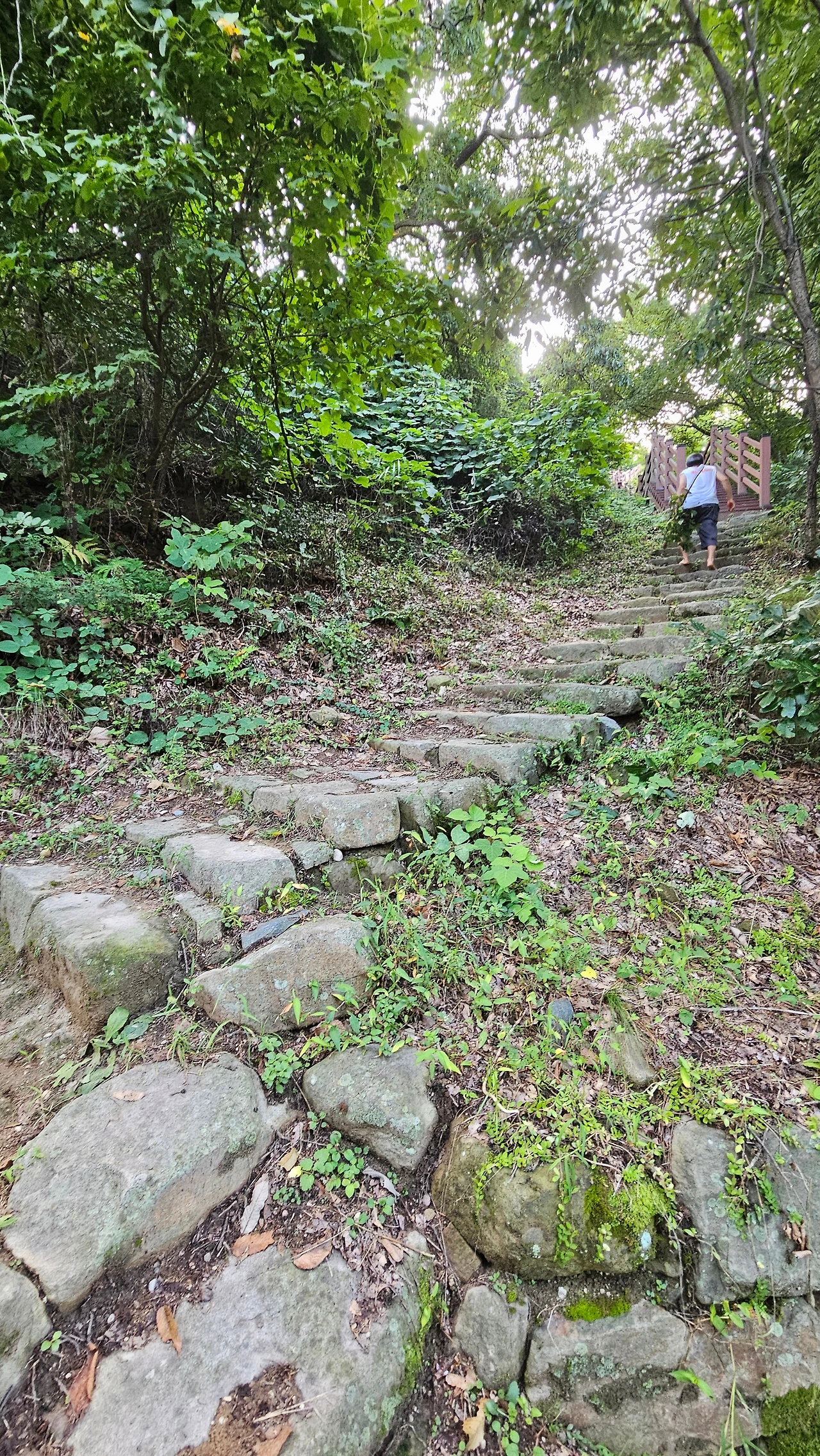 평탄하던 능선은 북문지에 다다를 즈음 비스듬한 내리막길에 이어 급한 비탈의 나무 데크 계단을 길게 내놓는다. 칡이 넝쿨을 계단 길 위까지 덮으며 진녹색 잎사귀 사이로 진분홍 꽃송이를 군데군데 내놓았다. 얼굴에 스치는 선선한 바람에 콧속으로 스며드는 은은하고 순박한 칡꽃 내음이 좋다.