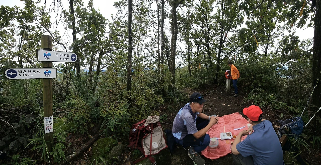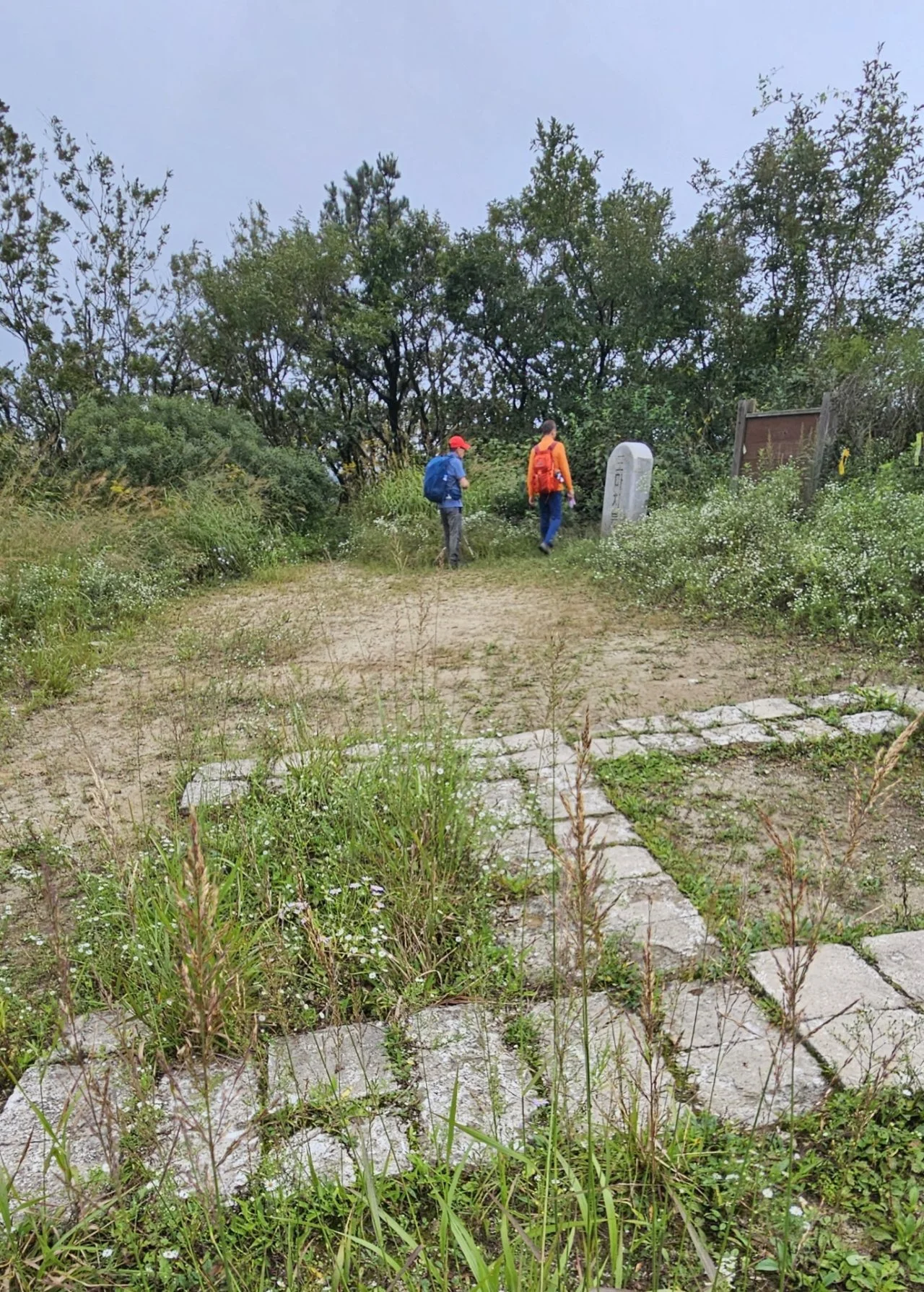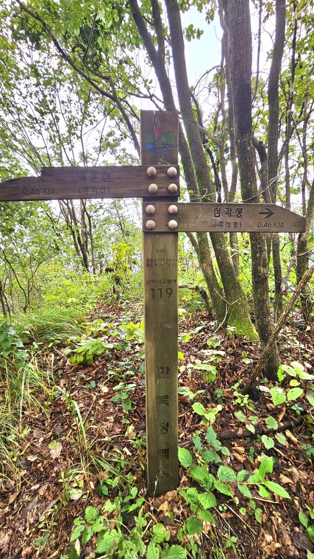 낡고 퇴색되어 글자가 희미한 이정표를 지나자, 바위를 앞세운 삼각봉이 비탈 위에서 기다린다. 삼각봉 위에는 노 산객 세 분이 고량주 빈 병 하나와 소주 한 병을 놓고 휴식을 하고 있다. 두세 번 권하는 바람에 종이컵에 소주 한 잔을 받아 들고, 배낭에서 샤인 머스캣 포도를 꺼내어 함께 나누어 들며 잠시 얘기를 나누었다. 고향 친구 사이라는 이들은 전국 유명산은 물론이요, 이곳 한북정맥을 비롯한 여러 정맥까지 두루 섭렵했다는데, 나보다 10년 정도 연배라는 나이에 비해 모두 젊고 건강해 보인다.