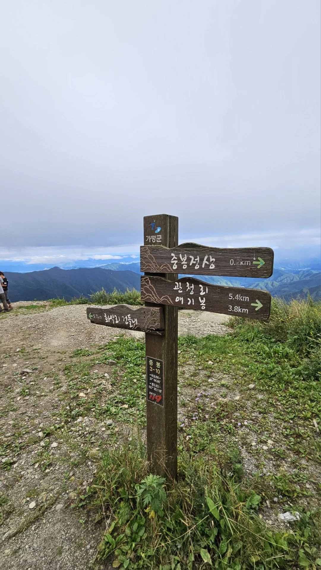 화악산은 군부대시설이 자리하여 출입이 금지된 해발 1468.3m 정상을 대신하여 그 옆 해발 1446.1m 중봉이 산객을 맞이한다. 차를 세운 곳에서 중봉까지는 고도 차이 약 80미터에 300여 미터 거리로 산행이라고 말하기조차 어설프다. 나처럼 그 턱밑에서 중봉에 올라 표지석과 함께 인증 사진을 남기는 산객이 적지 않다. 100대 명산 중 하나에 속하는 산에 대한 예의가 아닌 듯하고 산정은 안개로 조망이 없지만, 화악산 중봉에 정상에 올라선 감흥은 사뭇 남달랐다. 어쨌든 나로선 생애 처음으로 하루에 100대 명산 두 곳에 오른 나름 의미 있는 날이다.
