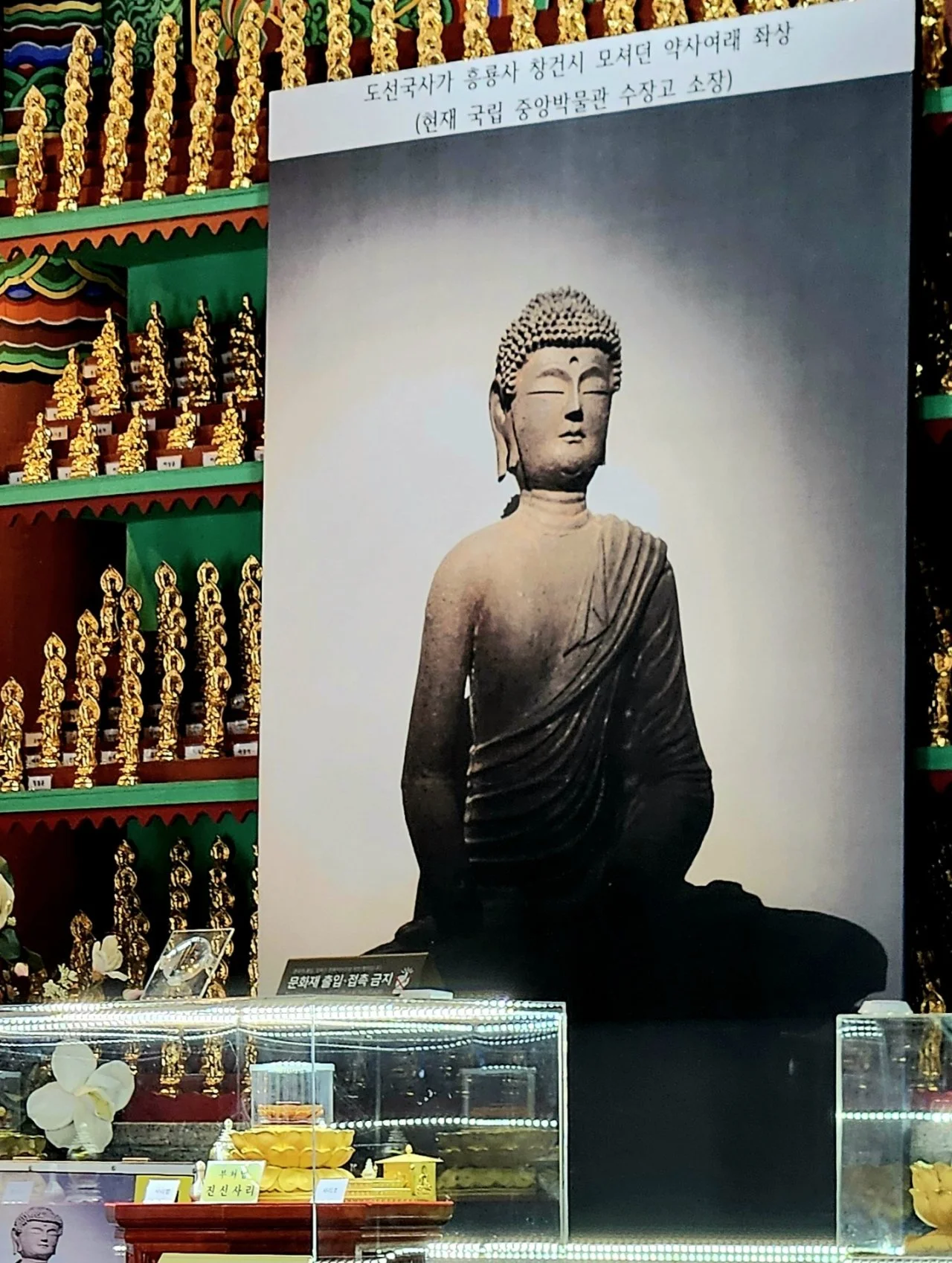 대웅전에는 삼존불과 함께 그 옆에 신라 말 도선국사가 흥룡사(興龍寺)를 창건할 때 조성한 것으로 추정된다는 철불 2기 중 약사여래좌상의 사진이 모셔져 있다. 사진 속 철조 약사여래상은 훤칠한 체형, 타원형 얼굴에 단정한 이목구비, 나발(螺髮)이 없는 민머리, 삼도(三道)를 넣지 않은 목 등이 더 현실적이고 친근감을 주는데, 그중에서도 지그시 감은 듯한 일자 형 긴 눈이 가장 인상적이다.