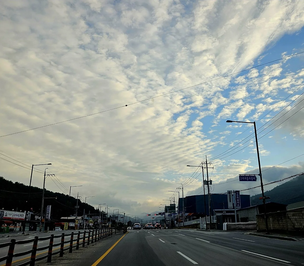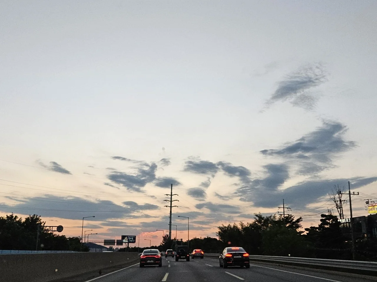 국도를 달리는 차 차창 밖으로 노을이 붉게 물든 서쪽 하늘에 라이트 블루 톤 옅은 구름이 샤갈의 작품 속 동물 마냥 몽환적 그림을 펼쳐 보인다. 그 속에는 상상 속 동물 현무(玄武), 비천상, 새앙쥐 등이 들어 있다. 아니다. 물건을 훔쳐 달아나며 고개를 돌려 뒤를 힐끔 쳐다보는 꼬리 긴 여우를 쏙 빼닮았다.
