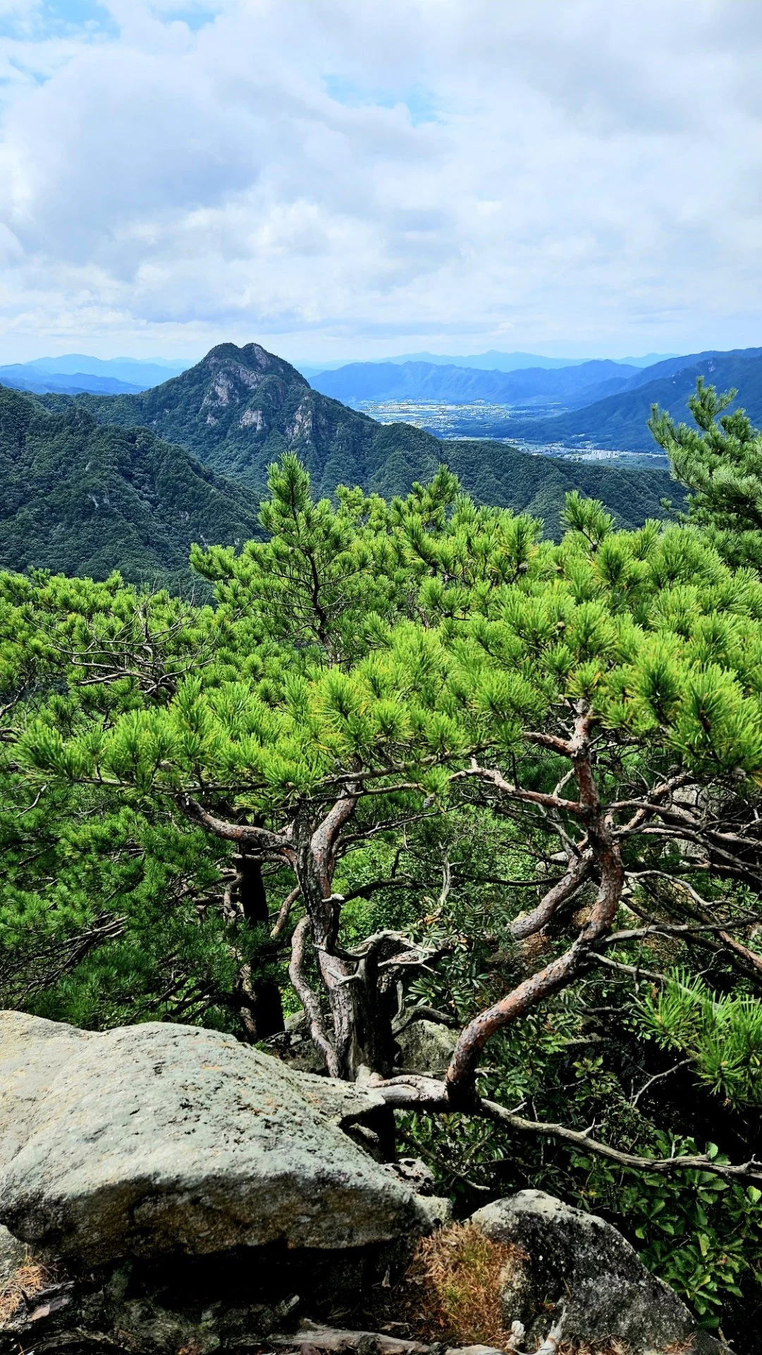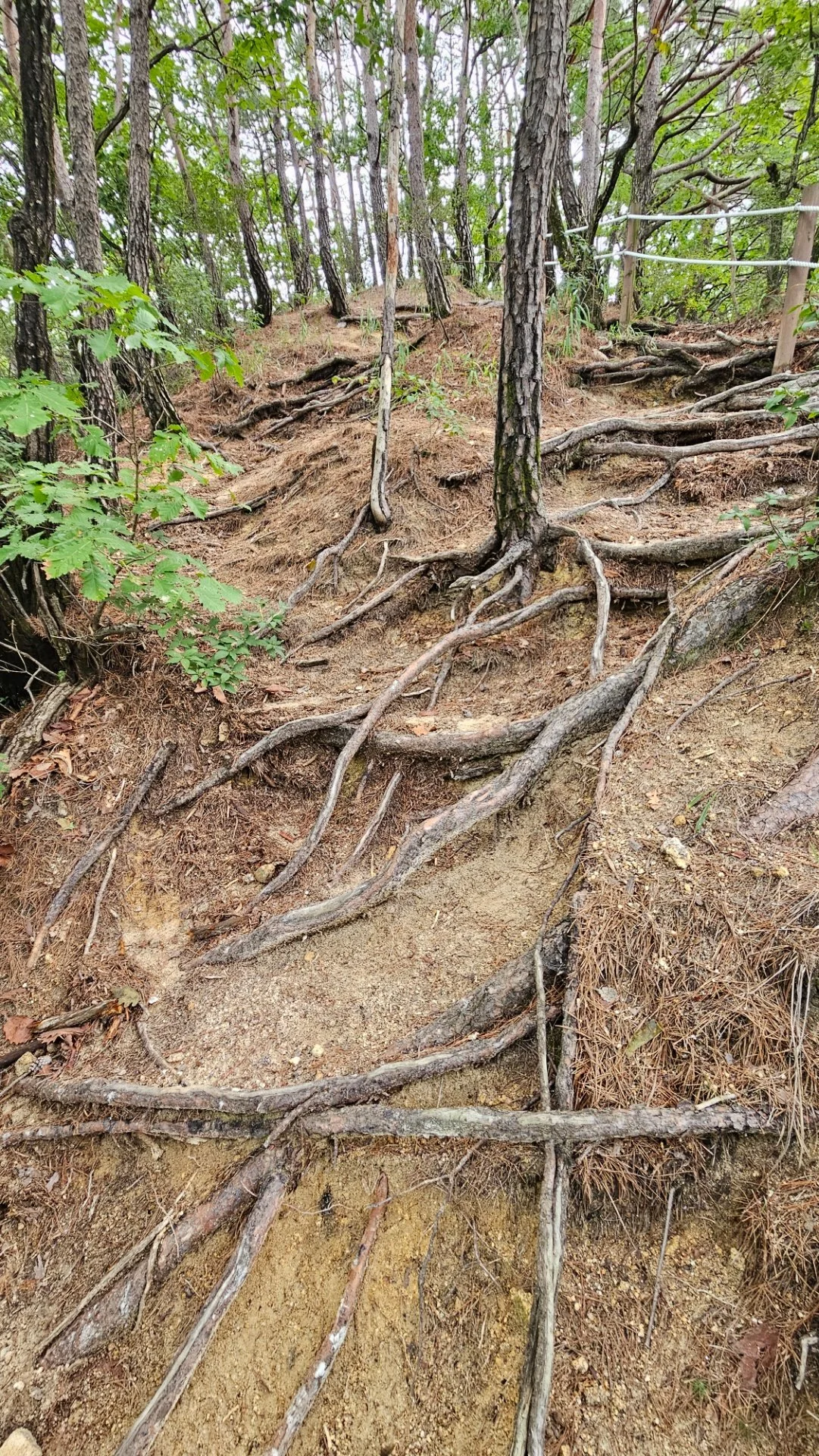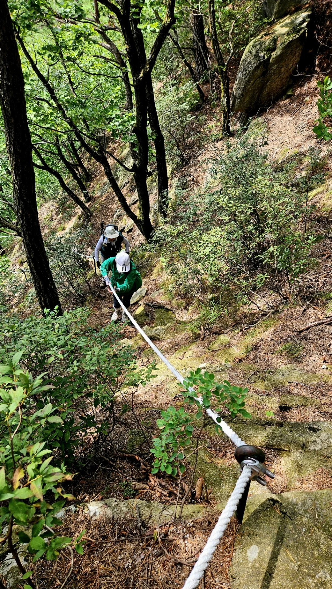 계곡에서 능선 마루를 향해 가파른 계단을 따라 치고 오른다. 가을 풀벌레 소리 온 숲을 채웠다. 최근에 내린 비 탓인지 등로는 군데군데 파이고 토사가 흘러내렸다. 패인 등로 흙을 부여잡고 굵은 힘줄처럼 뿌리를 드러낸 소나무들의 치열한 생명력이 가상하다. 간혹 거미줄이 얼굴에 걸리는 것으로 보아 오늘 이쪽 코스로 오른 산객은 없지 않을까 짐작된다. 능선 마루로 올라서기까지 별다른 조망이 없던 등로가 들머리에서 약 1km 지점부터 좌우로 나뭇가지 사이로 언뜻언뜻 조망을 내놓는다. 가로막아 선 암벽을 휘돌고, 밧줄을 잡고 바위에 박힌 철심 계단을 밟으며 오르는 구간이 이어진다.