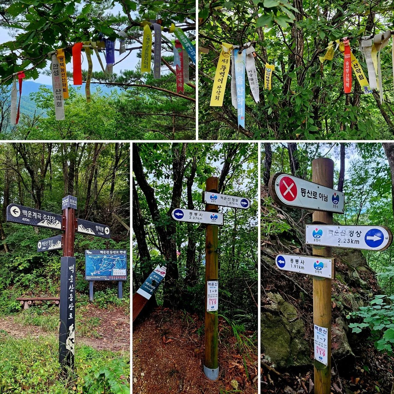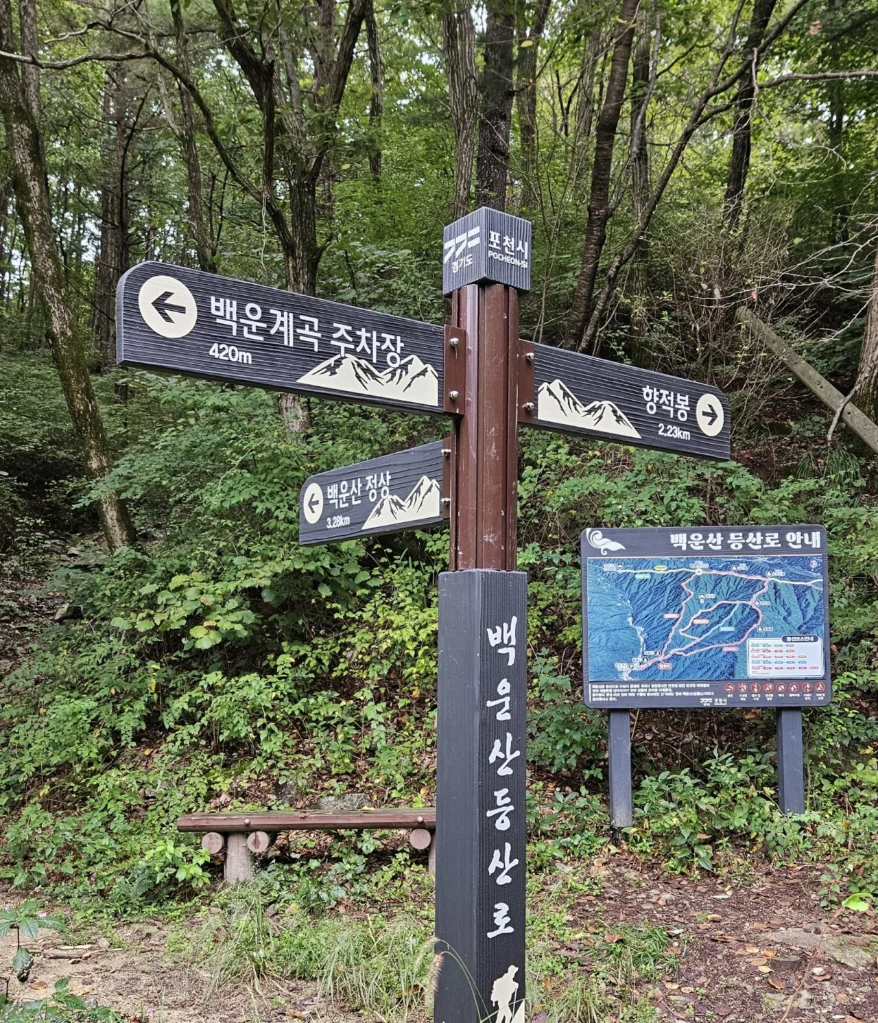계곡 위에 걸린 백운 1교와 백운 2교를 차례로 건너자, 들머리에 이정표와 산행 안내도가 서 있다. 좌측 능선 등로를 택하여 백운산 정상 ~ 삼각봉 ~ 도마치봉 ~ 향적봉 ~ 흥룡봉 ~ 흥룡사 코스의 약 14km, 대여섯 시간으로 예상되는 산행을 시작했다. 해발 약 280m 들머리에서 해발 903m 백운산 정상까지는 3.28km로 600여 미터를 올라야 한다.