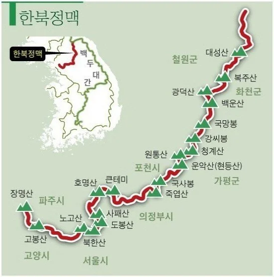 백운봉 정상에서 이곳 삼각봉과 앞쪽의 도마치봉으로 이어지는 능선은 백두대간(白頭大幹)의 추가령에서 서남으로 갈라져 나와 광덕산, 백운산, 국망봉, 운악산, 사패산, 도봉산, 북한산, 고양시 고봉산을 거쳐, 한강과 임진강 하구의 장명산에 이르는 294km 길이 '한북정맥'의 일부 구간이다.