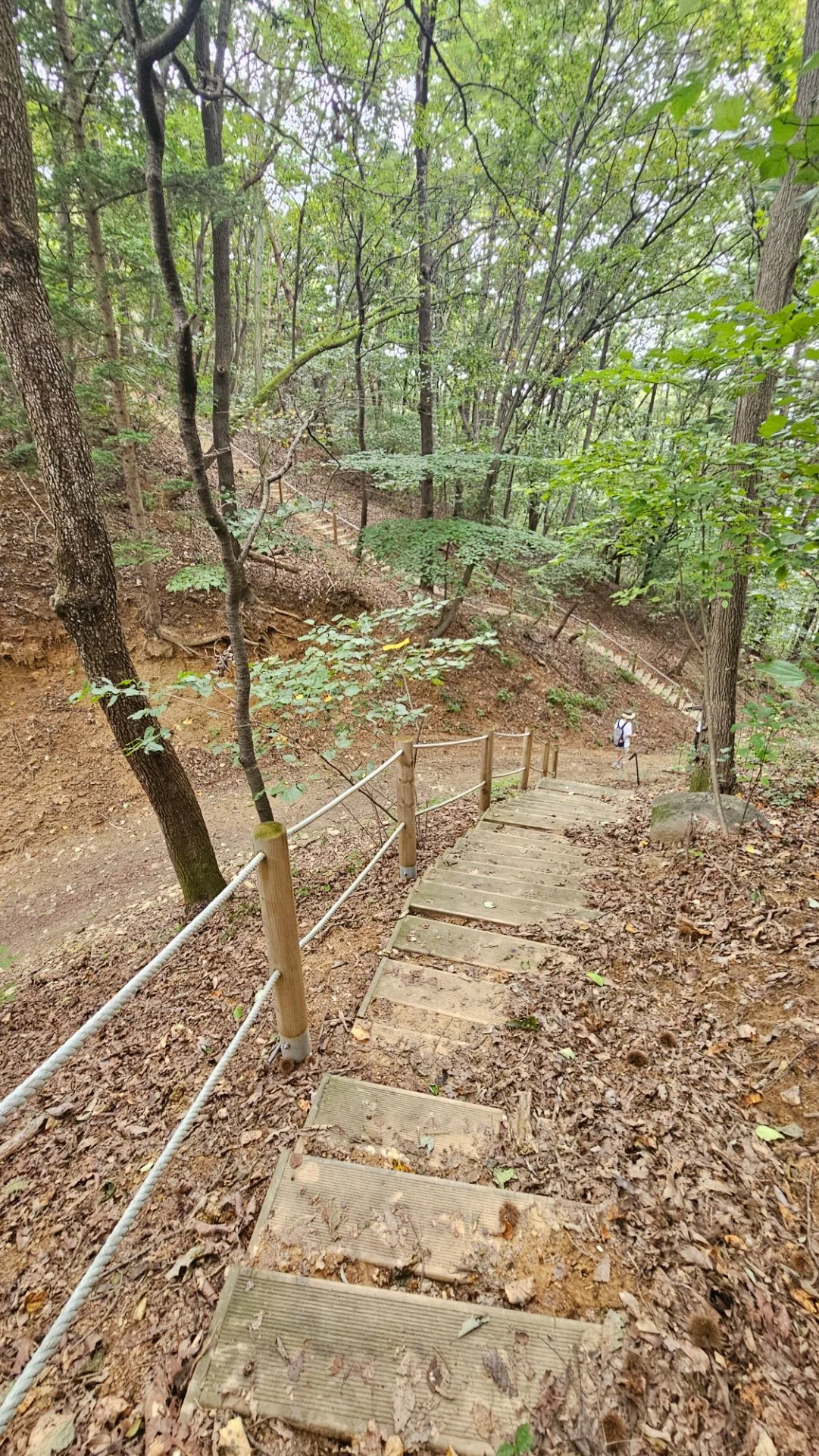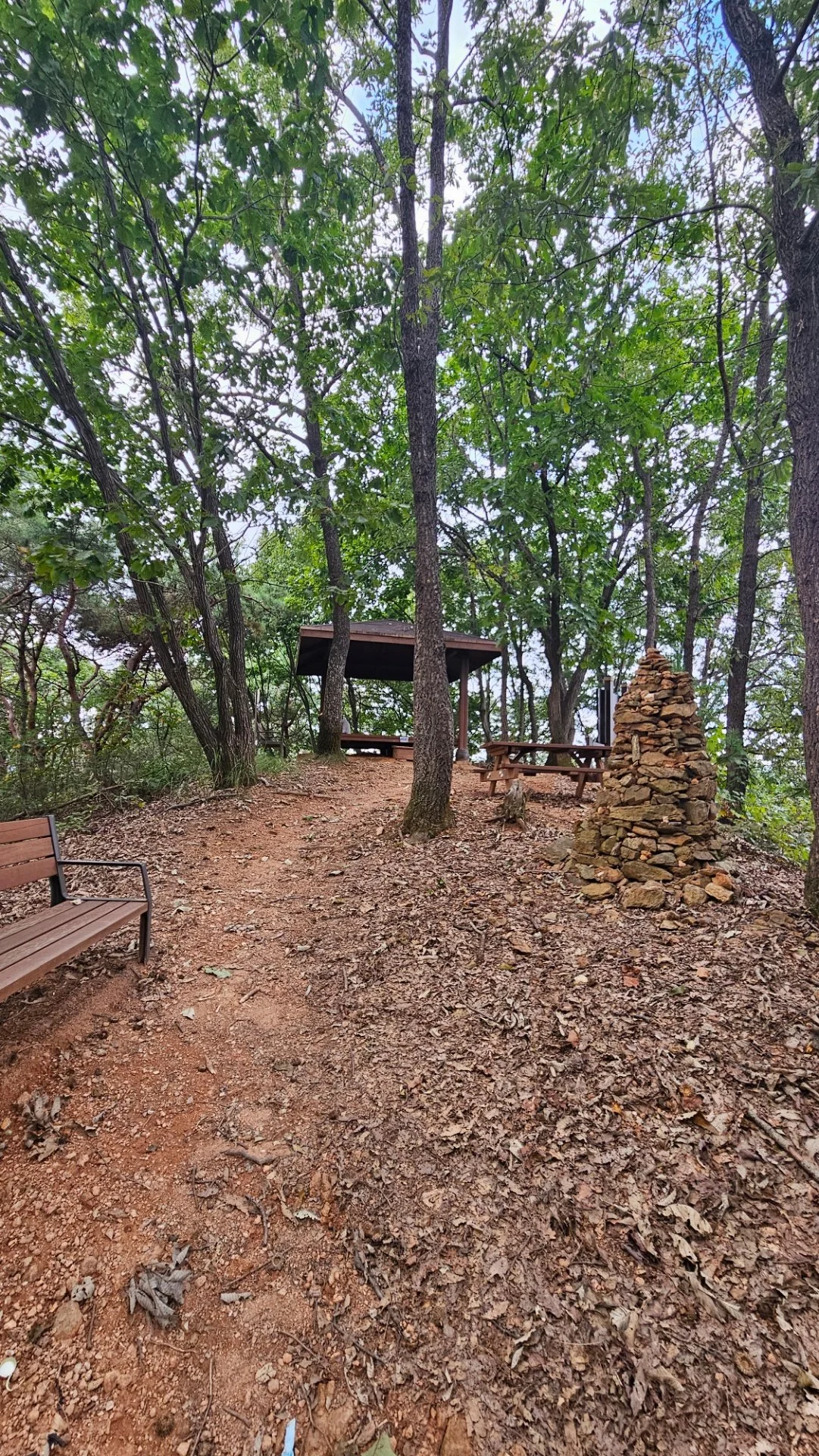 구터고개에서 맞주쳤던 산객을 좇아 벤치 여러 개와 돌탑 서너 기가 자리한 널찍한 금사봉으로 올라서니, 망조고개를 지나 경안천으로 내리 뻗은 능선 좌우로 경안천과 팔당호를 비롯한 지나온 둘레길 능선의 개략적인 윤곽이 나뭇가지 사이로 훤히 내려다보인다. 해발 207.3m 국사봉 정상을 백여 미터 남겨두고, 그 턱밑에서 80미터 지점에 있다는 약수터를 지나치고, 가파른 비탈에 놓인 나무 계단을 지나 4각 정자가 놓인 정상에 올라섰다. 정자에 나란히 걸터앉은 남녀 한 쌍은 인기척에 아랑곳없이 주고받던 세상사 얘기를 끊이지 않고 이어간다.