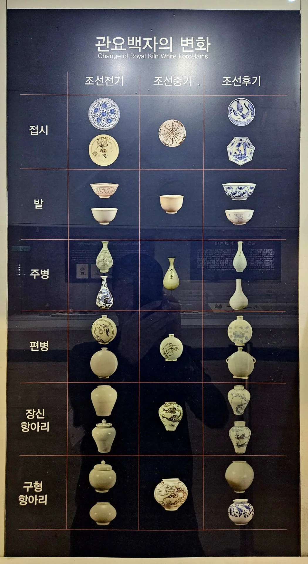관요 백자의 변화를 접시, 발, 주병, 편병, 장신 항아리, 구형 항아리 등 종류별로 조선 전기 중기 후기로 나누어 사진과 함께 일목요연하게 설명하는 자료가 흥미롭다. 그중 군용 수통처럼 납작하게 생긴 편병(扁甁)은 먼 길 나서는 여행자가 물병이나 술병으로 삼기에 적합해 보이는데, 조선 후기의 것은 양 옆구리에 끈고리가 붙어 있어 실용적으로 보인다.