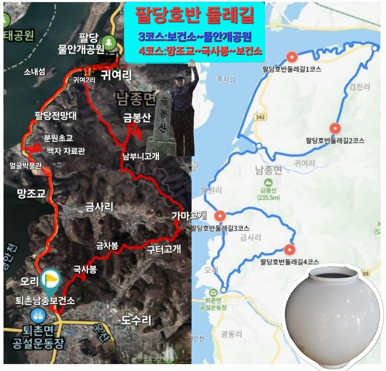 ‘송이재(松耳峴)’로도 불렸던 성황당 고개를 넘어설 무렵, 표지석이 퇴촌면에서 남종면 금사리로 경계를 넘고 있다고 알린다. 금사리로 들어서자, 길 옆 나무데크 휴게소가 팔당호로 접어들 채비를 하는 너른 경안천 하류를 산줄기 사이로 내놓는다. 마을에서는 닭 울음소리가 연신 들려온다. 약 3미터 간격으로 깃대에 단 태극기가 걸린 난간 너머 밭에서는 농작물을 돌보는 농부의 손길이 분주하다.
