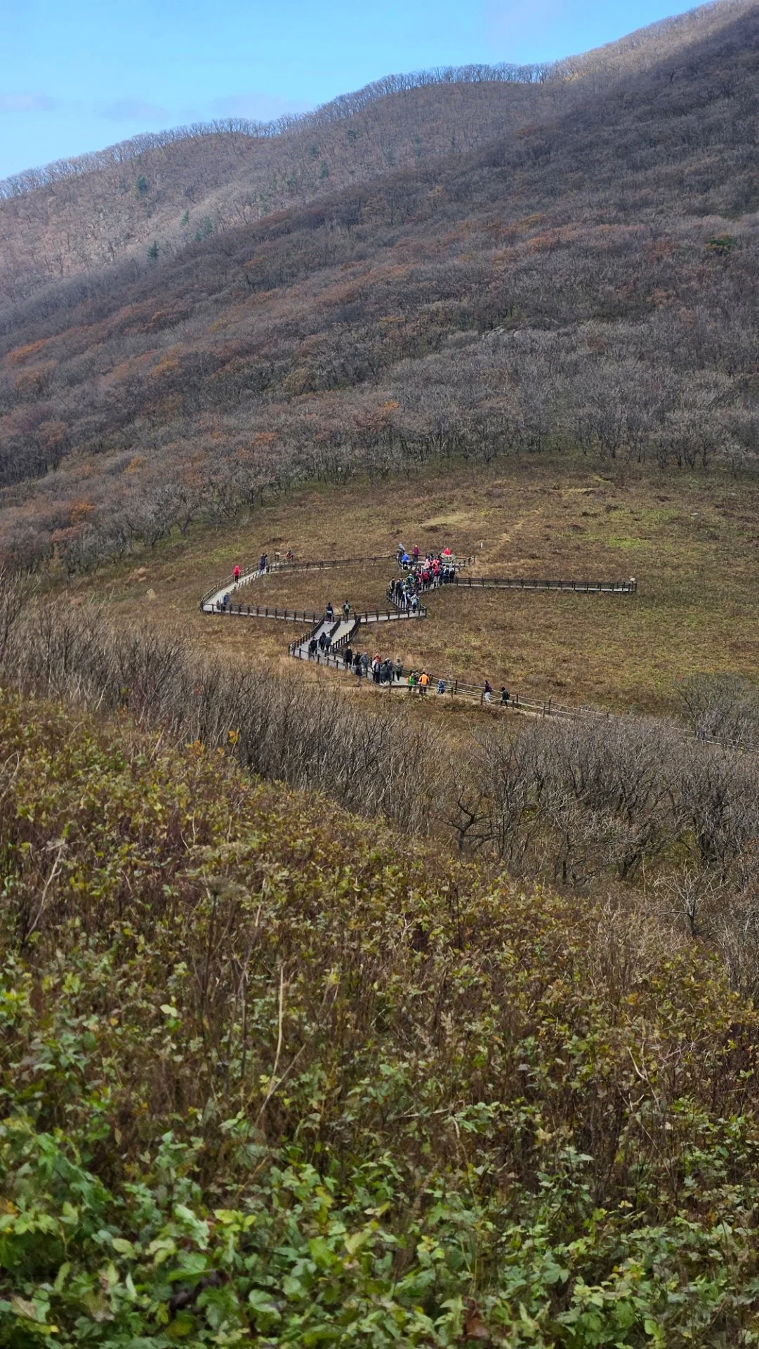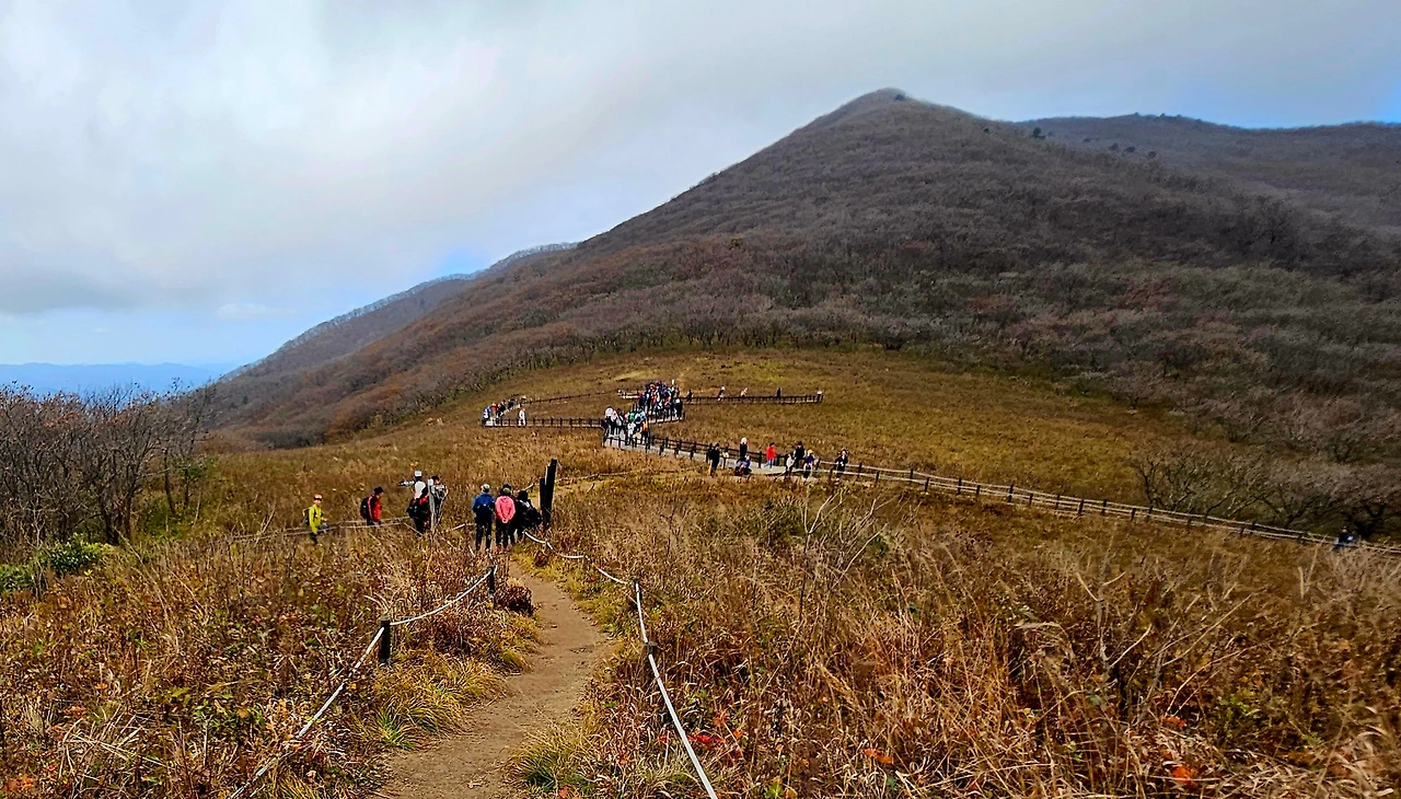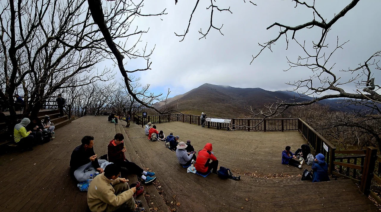 배를 하늘로 드러낸 채 드러누운 모양의 곰배령 표지석으로 내놓은 나무 데크를 따라 산객들이 길게 줄을 서있다. 그 줄의 끝에 서서 인증 숏을 남길 차례를 기다린다. 우리 뒤로도 연이어 올라오는 산객들이 줄지어 선다.