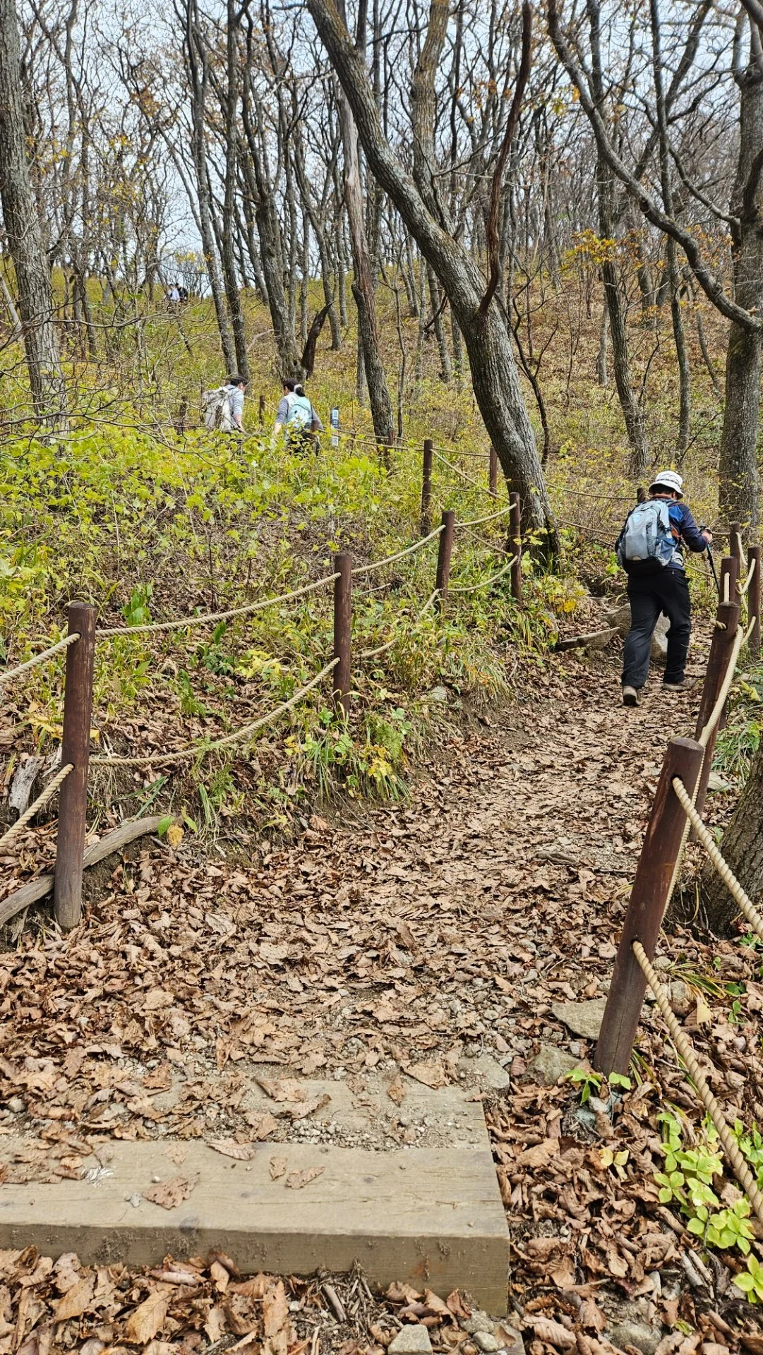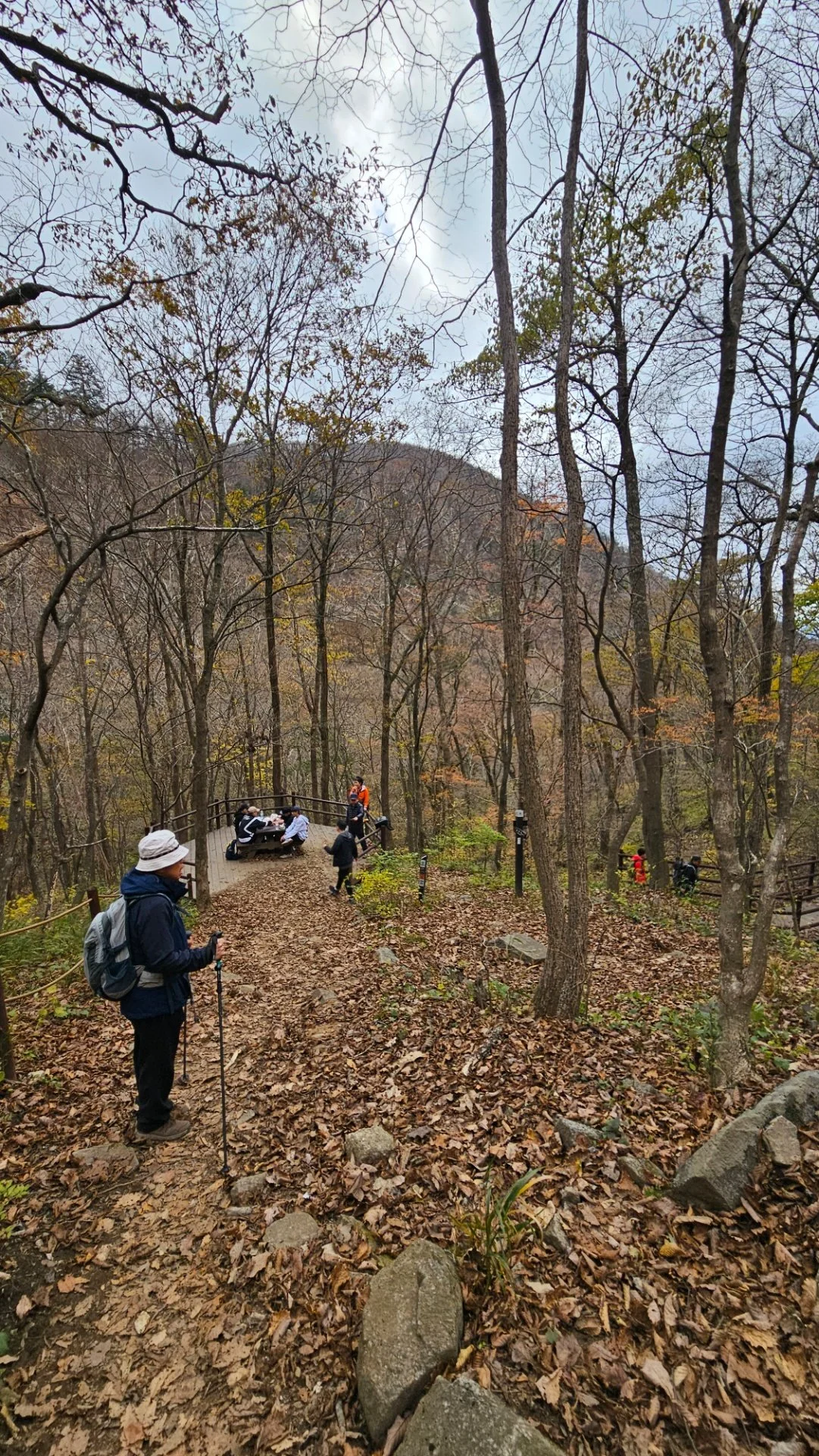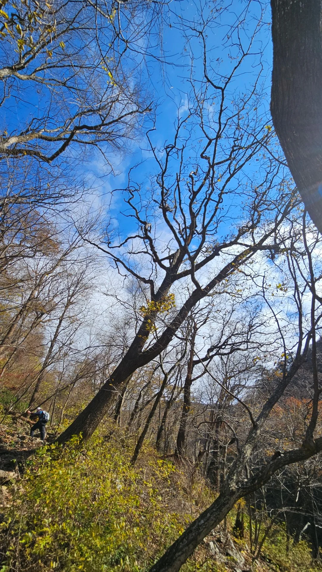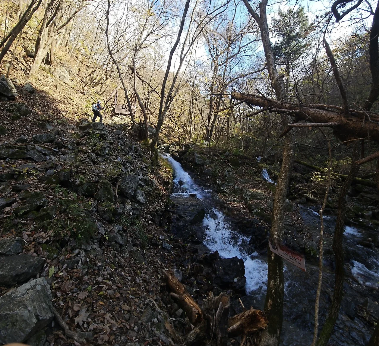 산악회의 '단풍 산행'이라는 글귀가 이번 산행을 부추겼지만, 정작 참나무 등 활엽수들은 대부분 잎사귀를 다 떨구고 가지를 드러내고 있다. 듬성듬성 성긴 숲 사이로 난 등로는, 때 이르게 가을이 지나간 듯 일면 을씨년스러운 분위기를 자아낸다. 반면, 비교적 짧은 산행 코스에 주어진 시간도 넉넉하여, 시간에 쫓기지 않고 계곡을 친구 삼아 산행인 듯 산책인 듯 느긋하게 걷는, 진정한 힐링 산행이라는 생각이 든다.