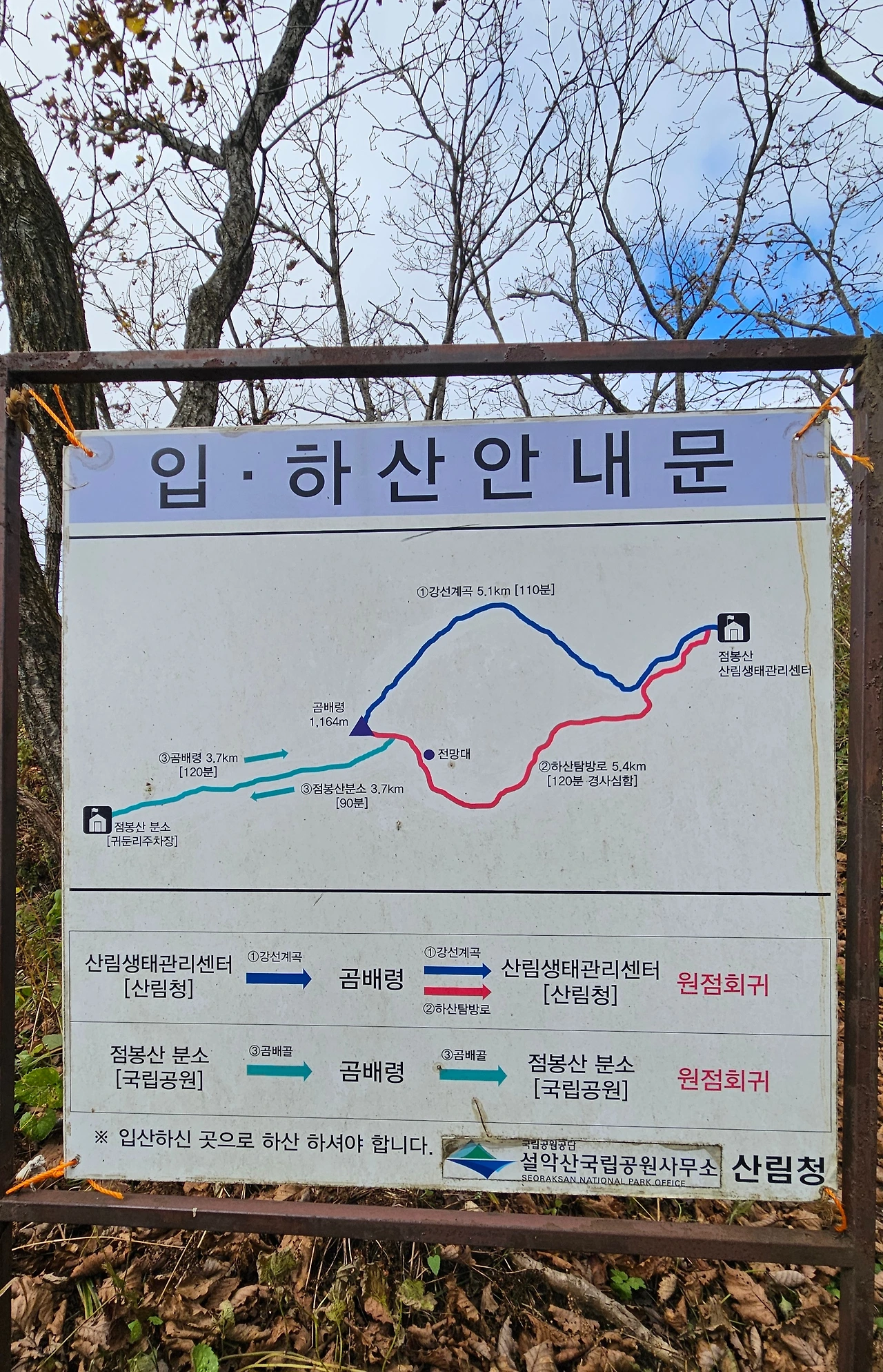 곰재골 표지석 맞은편의 안내도의 산행 코스는 이쪽과 반대편 강선리에서 곰배령까지 오르는 두 개로 단순하다. 해발 1426m 점봉산 정상은 곰배령에서 그리 멀지 않지만, 생태복원을 위해 출입을 금지하고 있다. 한반도 자생종의 20%에 해당하는 854종의 식물이 자라는 유네스코 지정 '생물권 보존구역'이니, 각별한 보존 노력이 필요할 만도 하다.