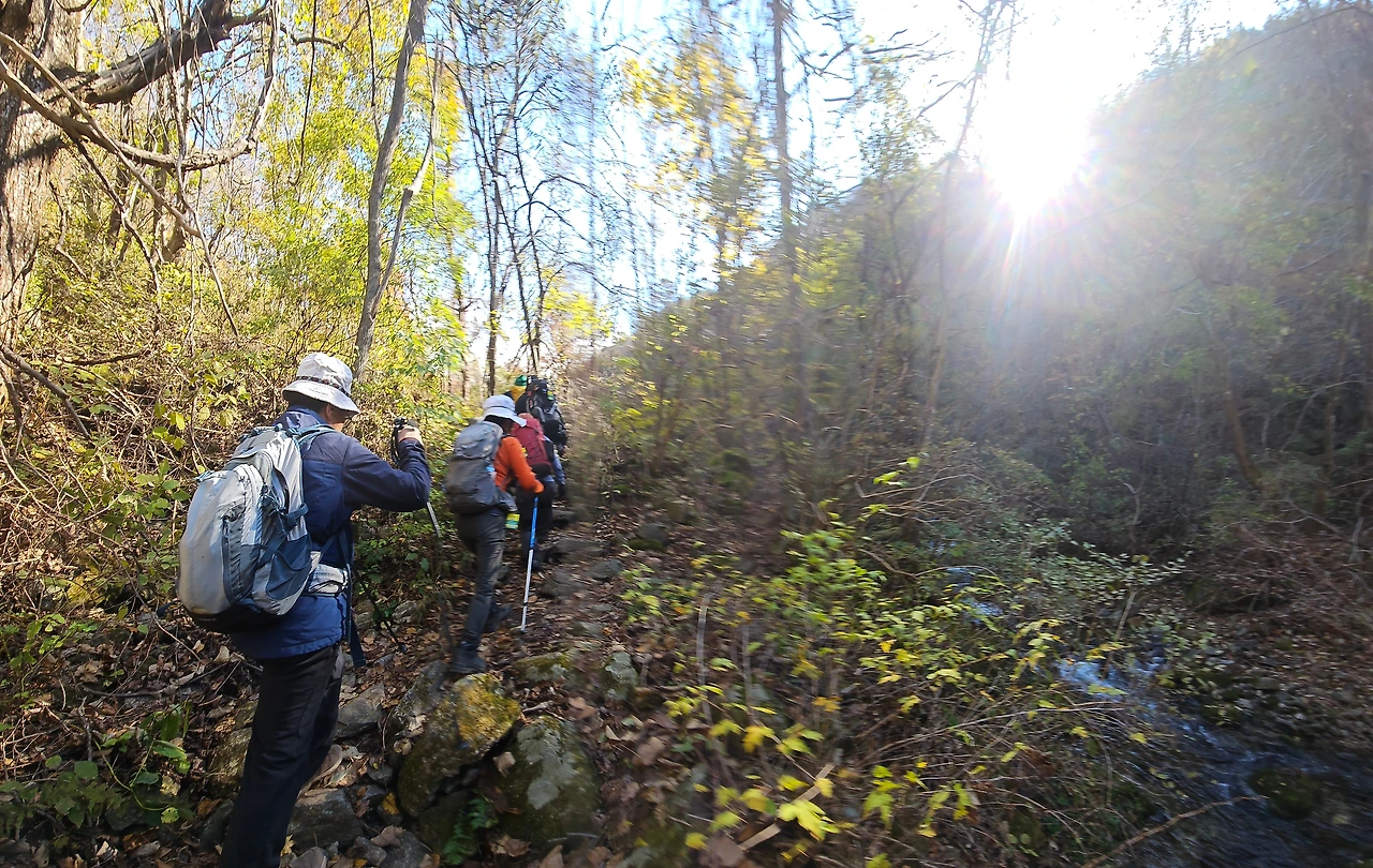 우리는 올라온 길을 되짚어 내려가야 하는 원점회귀 산행이다. 때 이르다 싶게 낙엽이 진 숲 사이로 난 자갈길, 바위 너덜길, 질퍽한 물웅덩이 길 등을 번갈아 지난다. 수량이 풍부한 계곡은 크고 작은 폭포를 내놓으며 길동무를 해준다. 귀둔리 주차장에 도착하니, 예정된 출발 시각까지 한 시간 여가 남아 있다.