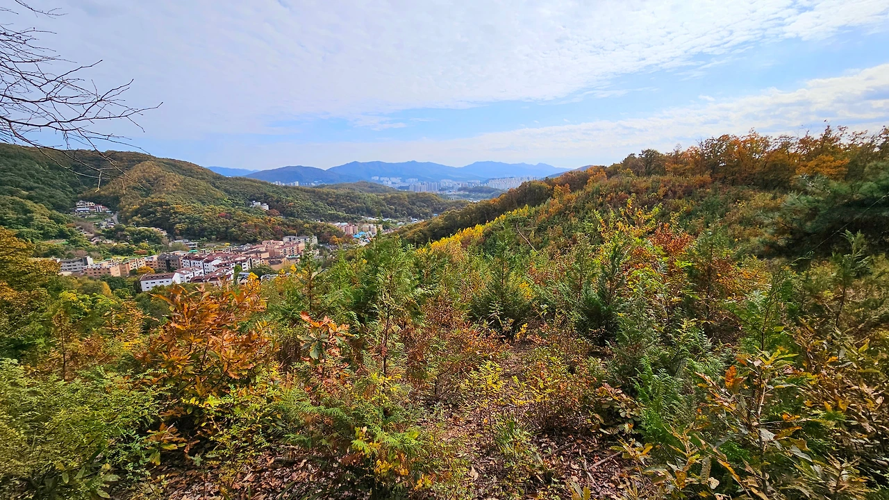 느린 경사의 능선 좌우는 쭉쭉 뻗은 소나무와 참나무가 어우러진 성긴 숲이다. 능선의 중턱쯤 올라서니 좌우로 삼동과 텃골 마을의 윤곽이 눈에 들어온다. 조금 더 오르니, 경충국도 너머 중대 물빛공원과 태전동을 비롯한 정광산과 태화산까지 전망이 펼쳐진다.