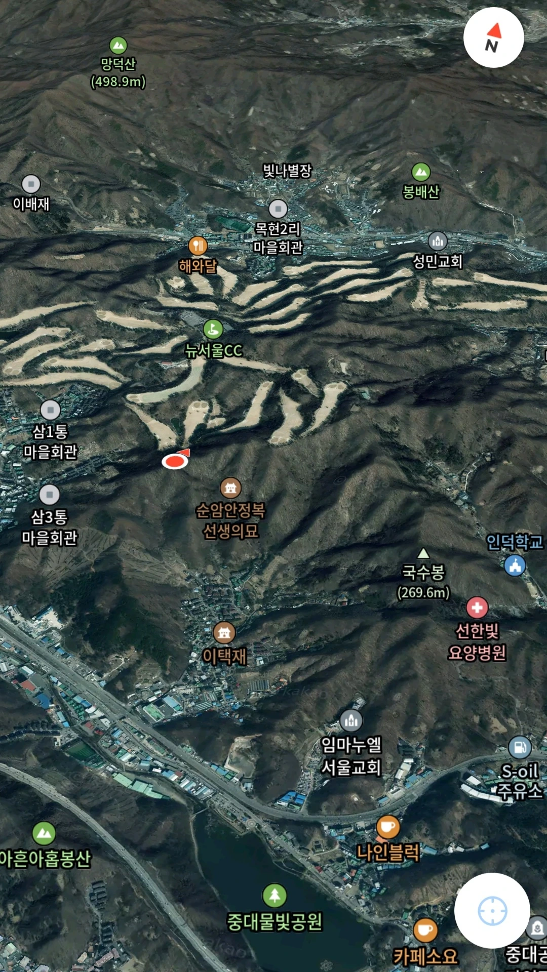 평탄한 능선길이 다하자 순암(順庵) 안정복(安鼎福, 1712-1791)의 묘소 위쪽 능선 마루로 가파른 비탈을 짧게 내놓는다. 고도 311미터 능선마루로 올라서니, 왼편 골프장의 필드가 능선 마루까지 치고 들어와 앉아 있다. 그린 옆 능선 가장자리 우측으로 난 등로를 지나자니, 깃대가 꽂힌 홀을 향한 한 골퍼의 신중한 퍼팅에 뒤이어, 동료들과 한목소리로 탄식이 이어진다. 아스팔트 카트 길과 단정한 잔디가 그림처럼 어우러진 골프코스가 한동안 등로를 따라오다가 멀어진다.