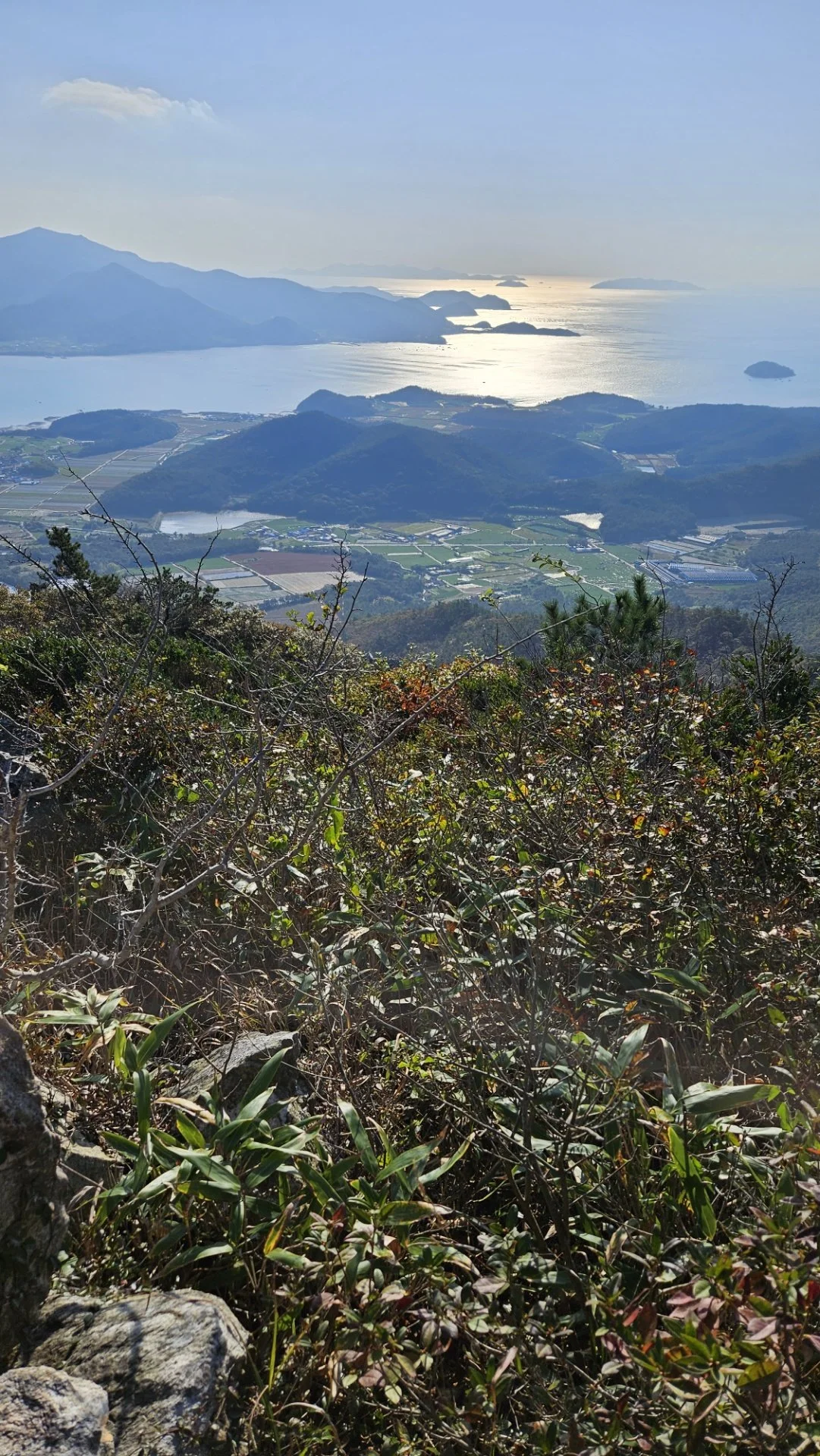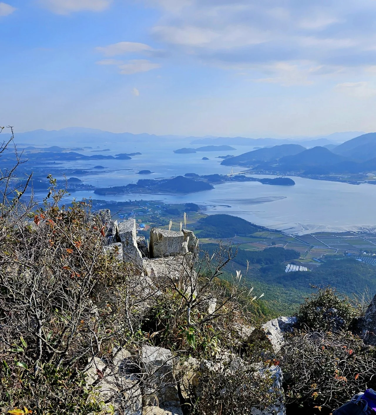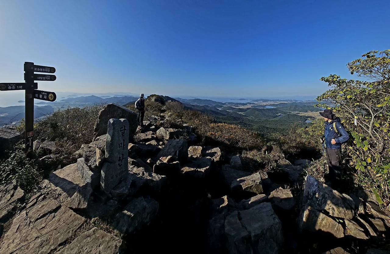 땀이 몸에 배고 이마에 맺힐 즈음 해발 489미터 달마봉 능선에 올라섰다. 허리가 끊겨 두 동강이 난 것을 포개어 세워놓은 달마봉 표지석이 비스듬히 서서 산객을 맞이한다. 표지석 지척 북쪽에 제단처럼 돌로 높이 쌓아 올린 터에 원추형 돌탑이 자리하는 곳이 달마산 최고 지점이다. 그곳에 ‘남도의 금강산’ 달마산과 다도해를 소개하는 안내판이 자리한다. 짧은 시간에 달마봉 정상에 올라서서, 아침 태양에 황금빛으로 물든 해면, 바다 위 양식장의 특이한 모습, 크고 작은 섬들이 흩어져 있는 다도해 등 황홀한 전경을 조망하는 기분이 남다르다.