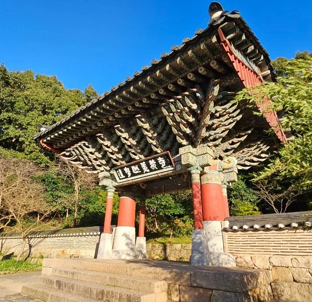 달마고도 마지막 네 번째 구간은 미황사 측면 뒤편으로 내려며 끝을 맺는다. 미황사 당우 곳곳은 ‘묵언 수행 중’이라는 푯말을 내걸고 고요에 잠겨 있다. 종무소를 지키고 있던 젊은 보살님이 국보로 지정된 응진전을 보고 가라고 귀띔해 준다. 이광사가 완성한 동국진체를 계승하여 새로운 경지를 개척한 신동국진체의 대가 학정 이돈흥(鶴亭 李敦興, 1947-2020) 선생이 쓴 자하루(紫霞樓)와 만세루(萬歲樓) 현판 글씨는 고졸한 해학미가 엿보인다.