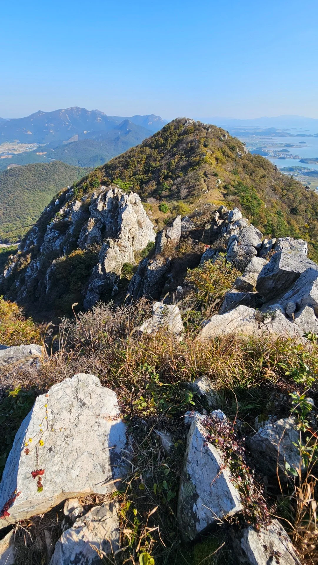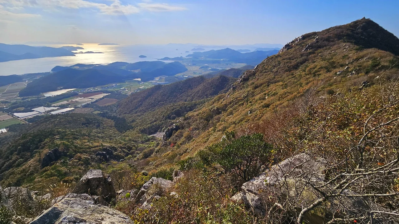 달마산 주 능선을 따라 북쪽의 관음봉을 향해 발길을 옮긴다. 산죽 숲 사이에 자리를 튼 키 작은 나무들은 옹골찬 줄기와 가지를 세찬 해풍에 꼿꼿하게 드러내 놓고 있다. 남해와 서해를 아울러 조망하면서, 공룡의 등처럼 날카로운 바위투성이 능선을 따라 거대한 암봉 관음봉을 지난다. 안부를 지나며 뒤돌아본 관음봉은 미황사 쪽 산기슭으로 금방이라도 쏟아 내릴 듯 수많은 암봉을 위태롭게 곧추세우고 있다. 그 모습은 마치 수천수만 불상인 듯, 미륵을 기다리며 깨달음을 얻으려는 수억의 인간 군상을 보는 듯도 하다.