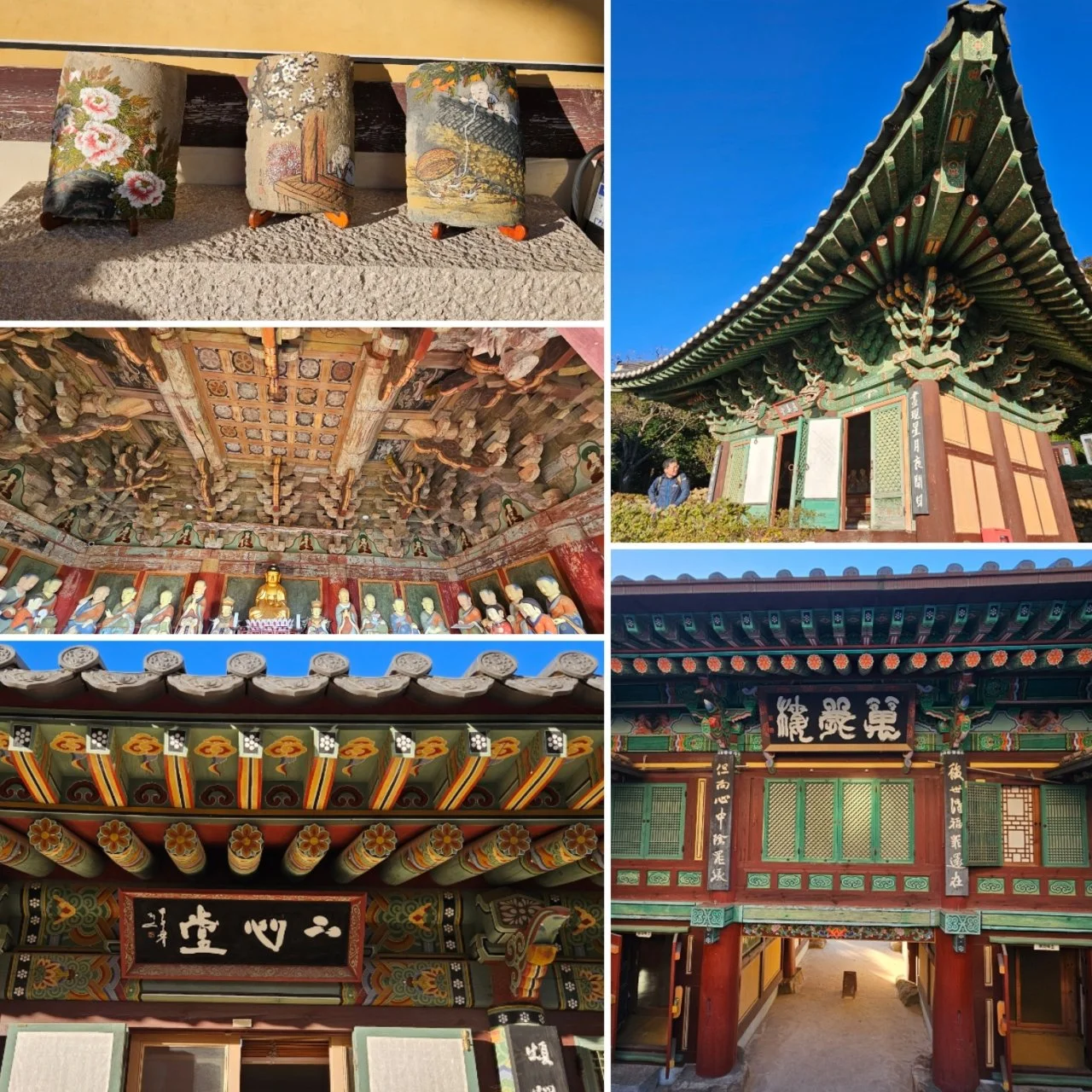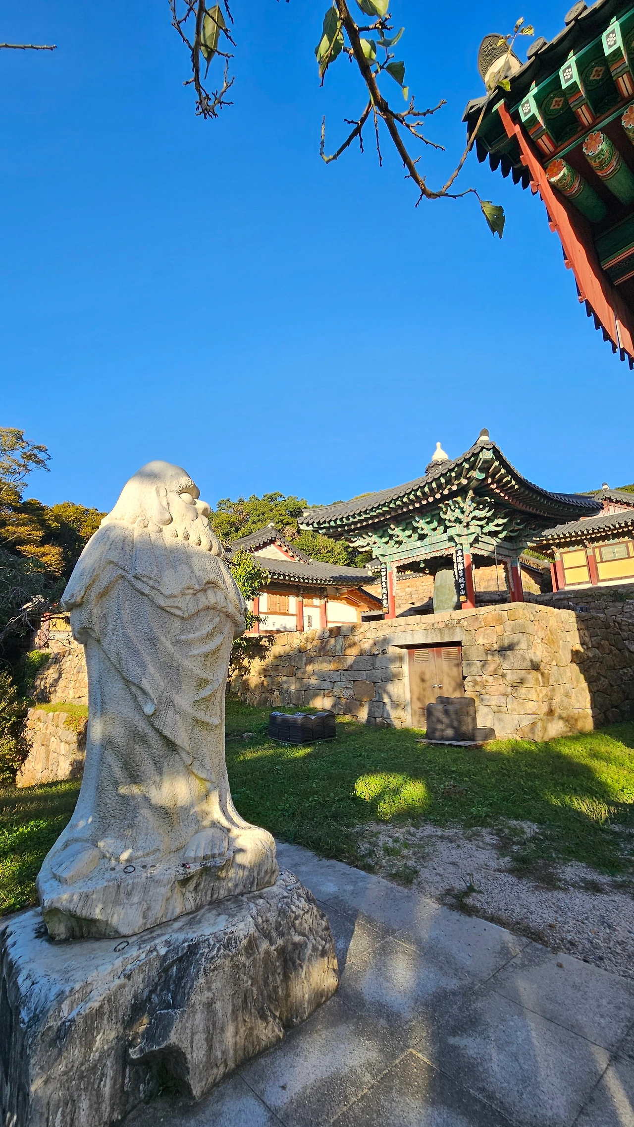 일주문에 걸린 ‘달마산 미황사라(達摩山美黃寺)’라는 독특한 한자의 현판은 전북 부안 출신으로 화가이기도 한 박방영(朴芳永, 1957~) 교수가 쓴 글이라고 한다. 그림이나 글씨 속에 사람과 꽃 등을 함께 그려 넣는 상형산수화 개척자가 쓴 글씨답다는 생각이 든다. 일주문에서 천왕문으로 오르는 길은 세상 고뇌를 다 벗어던지고 들어오라는 듯, 계곡의 물소리와 함께 108 계단이 인도한다. 미황사는 겨울을 앞두고 여러 당우의 보수공사와 개축 공사가 한창 진행되고 있다. 천왕전 우측에는 새 당우 건축이 진행 중인데, 목공이 지붕 위에서 내림마루 골조를 자귀로 쪼아 다듬고 있는 모습이 보인다.
