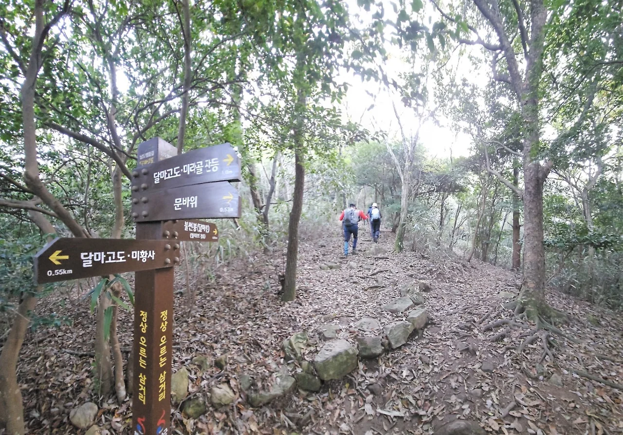 천왕문 좌측으로 난 길을 따라 달마산 자락으로 접어들었다. 우리 일행은 예정대로 큰바람재로 난 달마고도 제1코스 대신에 달마봉으로 방향을 잡았다. 자연석으로 반듯하게 놓은 돌계단 길에 이어 너덜 바위 지대의 가파른 비탈길이 나타난다. 미황사에서 달마봉까지는 1km 남짓 짧은 거리이지만, 해발 180여 m에서 해발 489m까지 고도를 300여 m 높여가는 만만찮은 산길이다. 한 손으로 스틱을 짚으며 다른 손으로는 앞사람이 밟고 지나간 바윗돌을 짚으며 산정으로 발길을 재촉했다.
