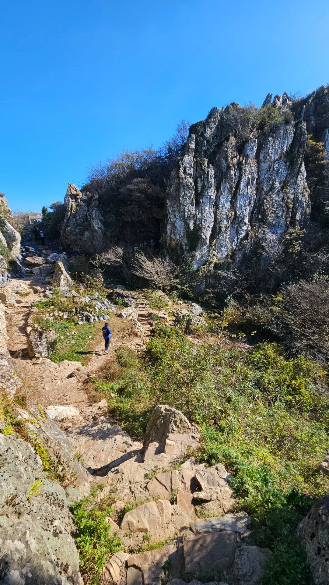 달마고도 제3구간 ‘고행의 길’도 크고 작은 바윗돌이 예리한 모서리를 드러낸 바위덜설 능선 길보다는 낫지 않을까 짐작된다. 마지막 암봉은 수정골 사거리 쪽으로 급경사의 너덜 바위 길을 100여 미터 내놓는다. 너덜 길이 끝나고, 산죽이 숲을 이룬 폭신한 흙길이 미황사에서 2.6km 지점인 달마고도 제1구간의 끝 지점인 수정골 사거리로 인도한다.