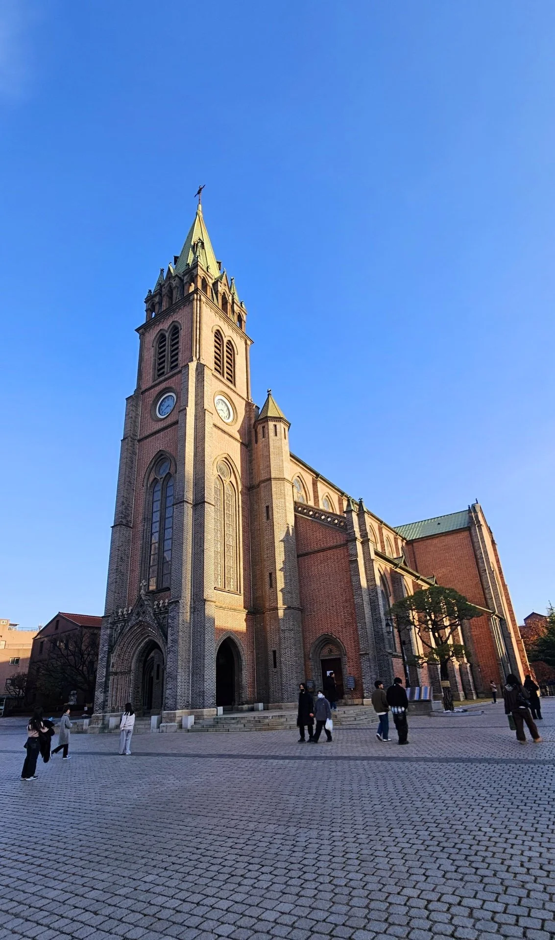 둥근 아치, 두꺼운 벽, 튼튼한 기둥 등 로마네스크 양식에 높은 첨탑과 스테인드 글라스 창문 등 고딕 양식을 가미한 명동성당이 쌀쌀한 공기 속에 다소곳이 아름다운 자태를 여미고 있다.