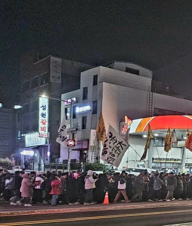 청파동에서 서울역으로 향하는 중에 길 건너편에 용산 방향으로 행진하는 긴 시위대 행렬이 보였다. 사물 장단에 걸음을 옮기는 수많은 깃발의 행렬은 "헌법을 준수하고 국가를 보위" 할 것을 국민 앞에 엄숙히 선서했던 대통령의 자유와 민주에 대한 '웃픈' 도발에 대해 책임을 추궁하고 있다.