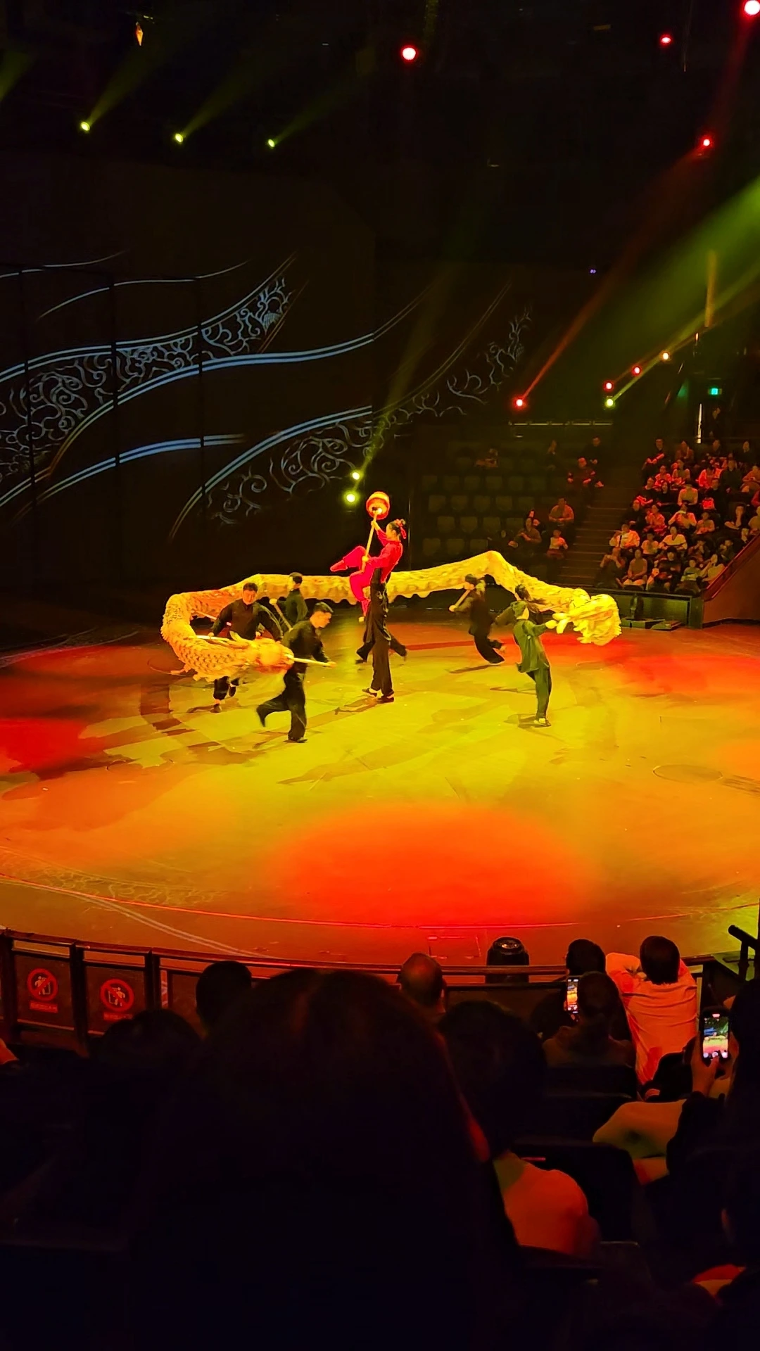 싸늘한 바깥과는 달리, 공연장 안 공기는 조금 덥게 느껴졌다. 공연 시간이 다가오자, 텅 비었던 객석은 무대 정면과 마주한 VIP 좌석을 제외하고는 거의 다 채워졌다. 공연은 공중에 매여 길게 널어뜨려진 천을 이용한 묘기, 막대를 이용한 공중제비 묘기, 구형 철망 안에서 펼치는 오토바이 타는 묘기, 공중그네에 매달려 비둘기들과 펼치는 묘기, 막간의 짧은 용춤 공연, 남녀 한 쌍이 펼치는 공중그네 묘기, 널뛰기를 이용한 공중제비 묘기, 자전거와 굴렁쇠 묘기 등 중간의 15분 휴식 시간을 전후하여 약 90분간 이어졌다.
