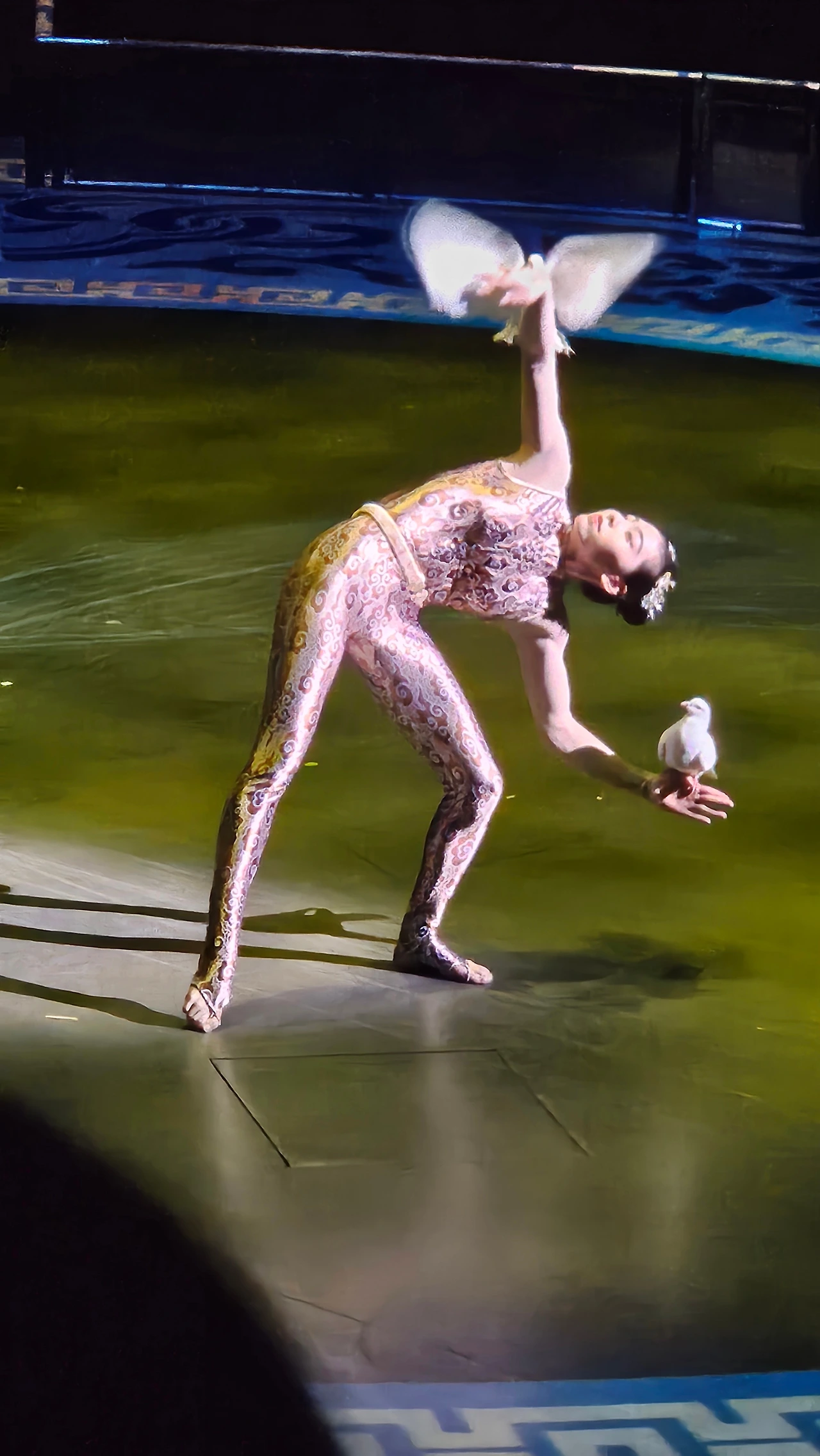 남녀 공연자들의 섬세하고 절제된 몸동작 하나하나는 치밀한 타이밍이 반영되어 있다. 공중 줄타기와 공중그네 묘기, 널뛰기와 탑 쌓기 기계체조를 접목한 묘기의 멈추고 띄고 동료를 떠받치는 동작 등에는 강인한 체력과 과감한 결단력이 읽힌다. 자그마한 여성이 비둘기 떼와 함께 펼치는 공중그네 공연자의 묘기는 대담하면서도 섬세하고 미려하다.