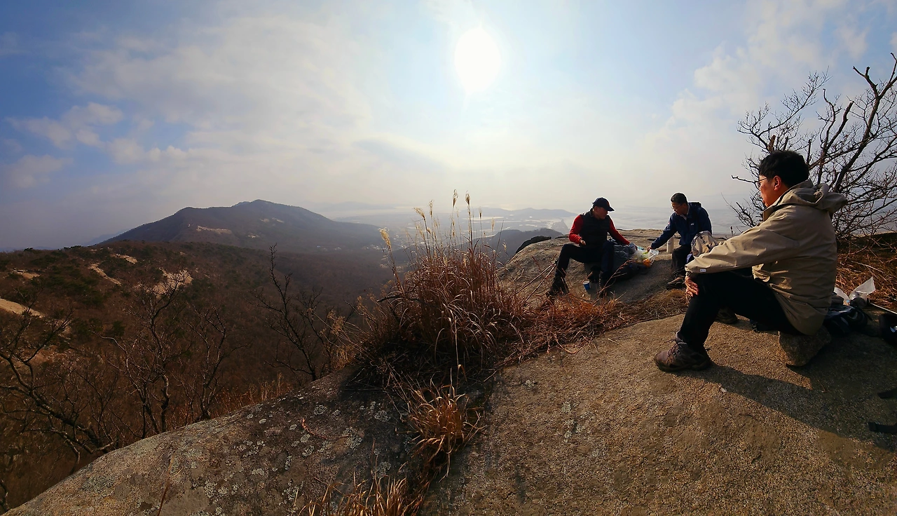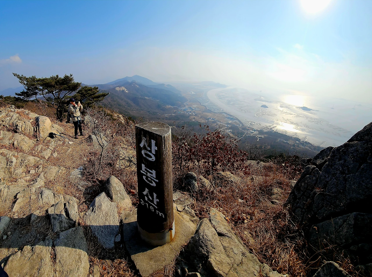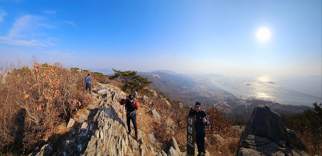 고개 위에 걸린 출렁다리를 건너 북쪽으로 뻗은 느린 경사의 능선을 타고 오르자, 좌우로 너른 갯벌을 드러낸 바다가 눈에 들어온다. 이십여 분 만에 시야가 탁 트인 능선 마루에 올라섰다. 우측으로 마니산 혈구산 고려산 등 강화 본섬의 여러 산과 흐릿하게 모습을 드러낸 남서쪽의 불음도 아차도 장봉도 등 여러 섬을 가늠하며 조망했다.
