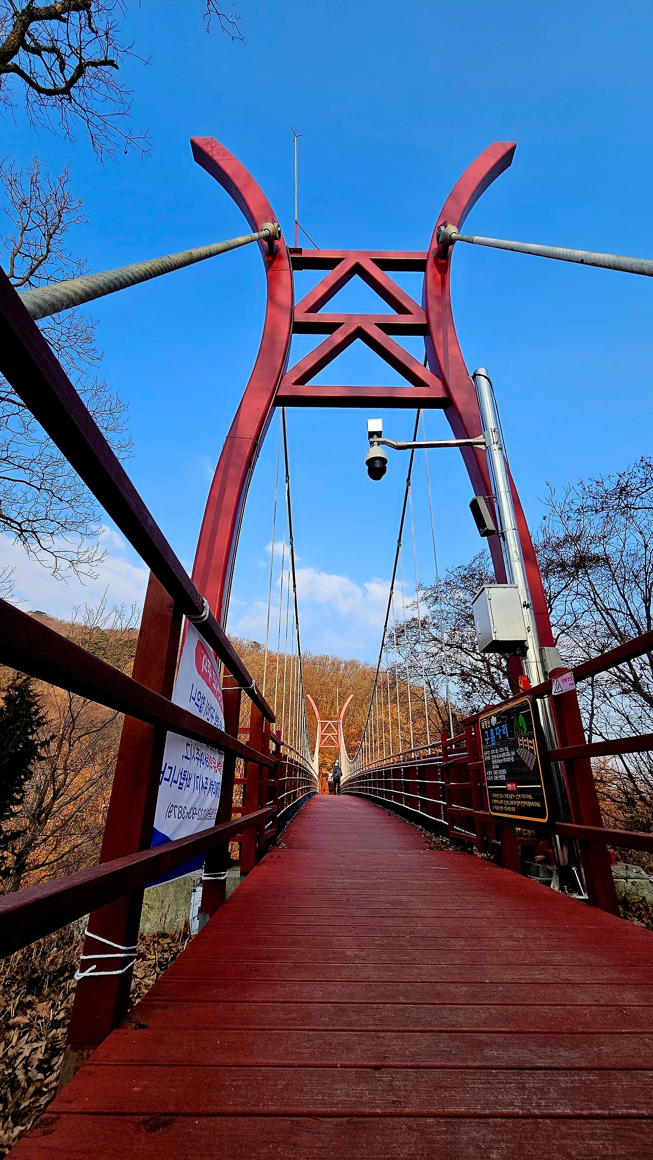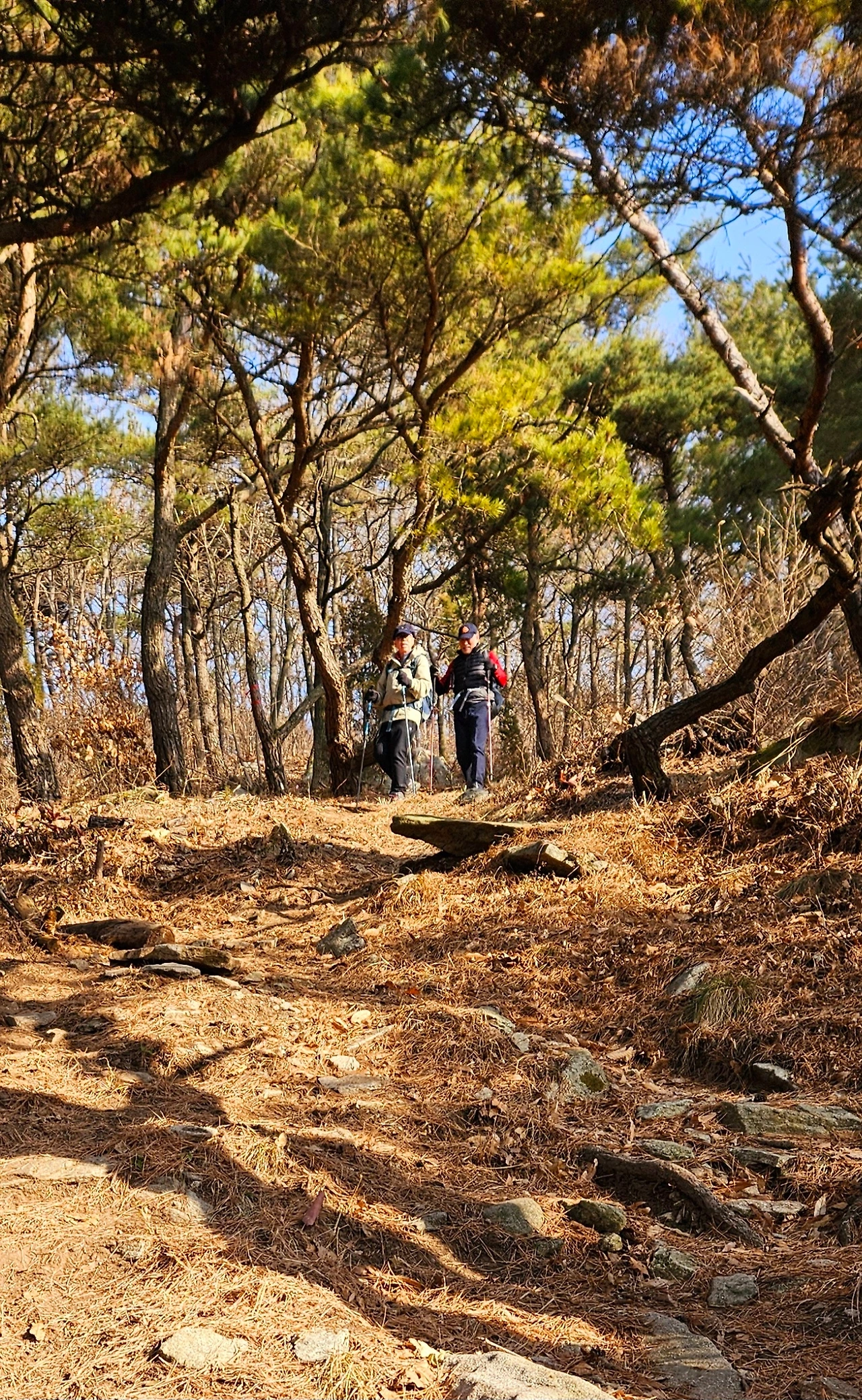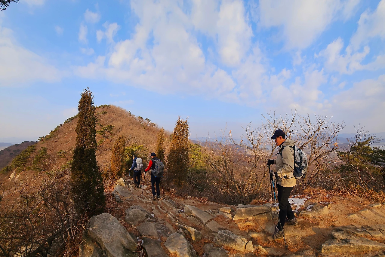 고개 위에 걸린 출렁다리를 건너 북쪽으로 뻗은 느린 경사의 능선을 타고 오르자, 좌우로 너른 갯벌을 드러낸 바다가 눈에 들어온다. 이십여 분 만에 시야가 탁 트인 능선 마루에 올라섰다. 우측으로 마니산 혈구산 고려산 등 강화 본섬의 여러 산과 흐릿하게 모습을 드러낸 남서쪽의 불음도 아차도 장봉도 등 여러 섬을 가늠하며 조망했다.