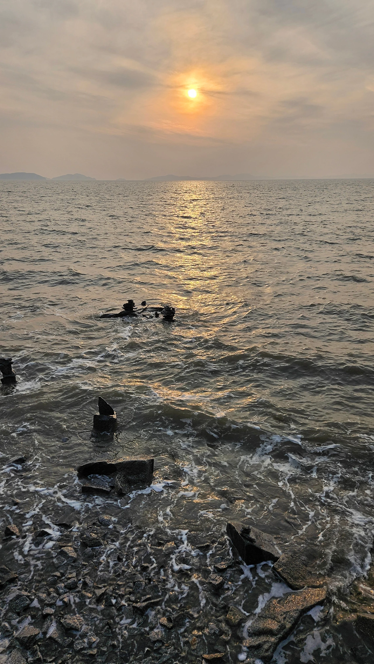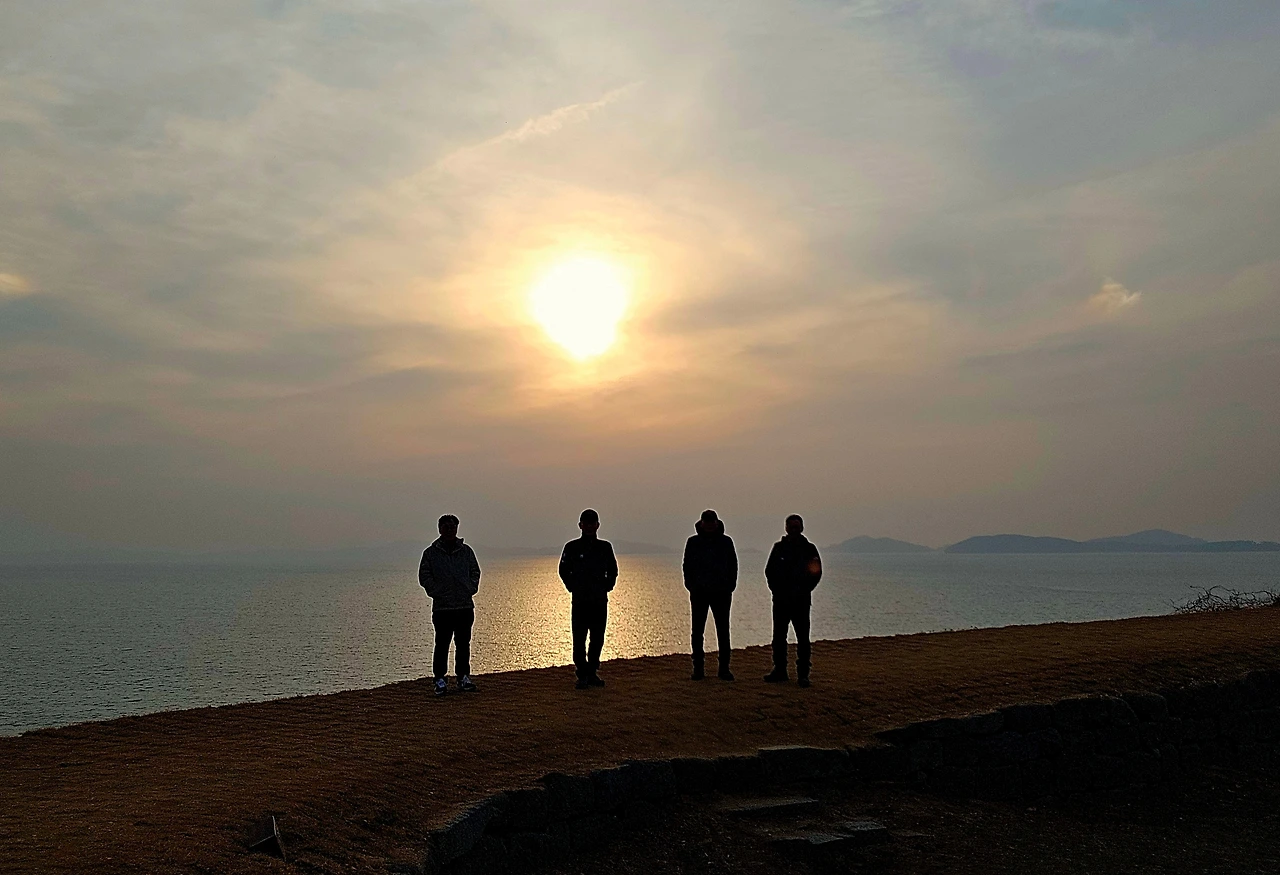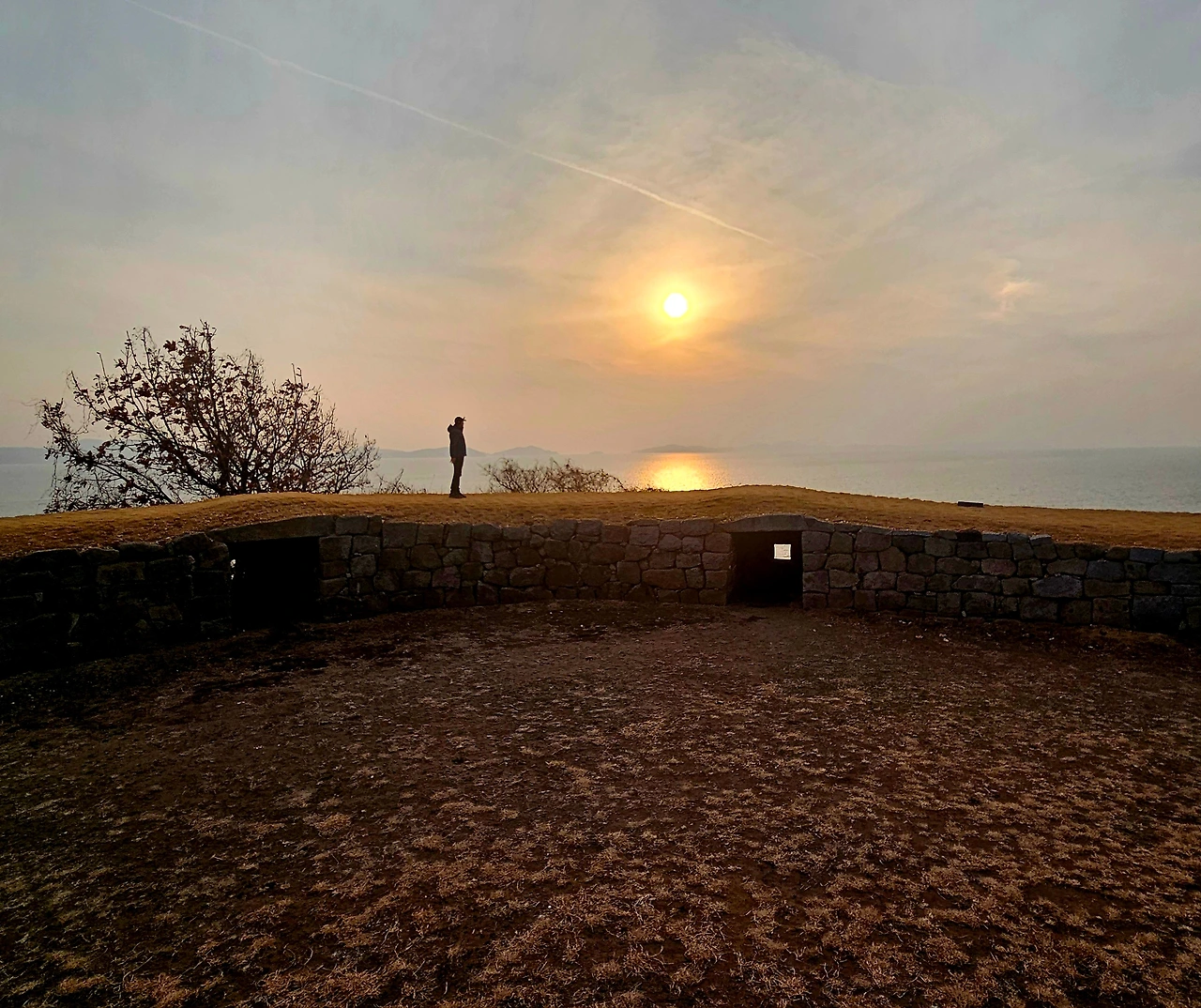 구수한 우럭 지리탕과 더불어, 식탁에 내놓은 김치와 깍두기 모양의 순무 김치는 젓갈 특유의 감칠맛에 더하여 상큼하고 개운한 맛이 특별났다. 식당을 나서서 분오리 돈대에 올라 서쪽으로 기우는 해를 감상했다. 돈대 아래 산책로 해변에는 누군가가 놓은 돌탑들 사이로 바닷물이 밀려오고 밀려간다.