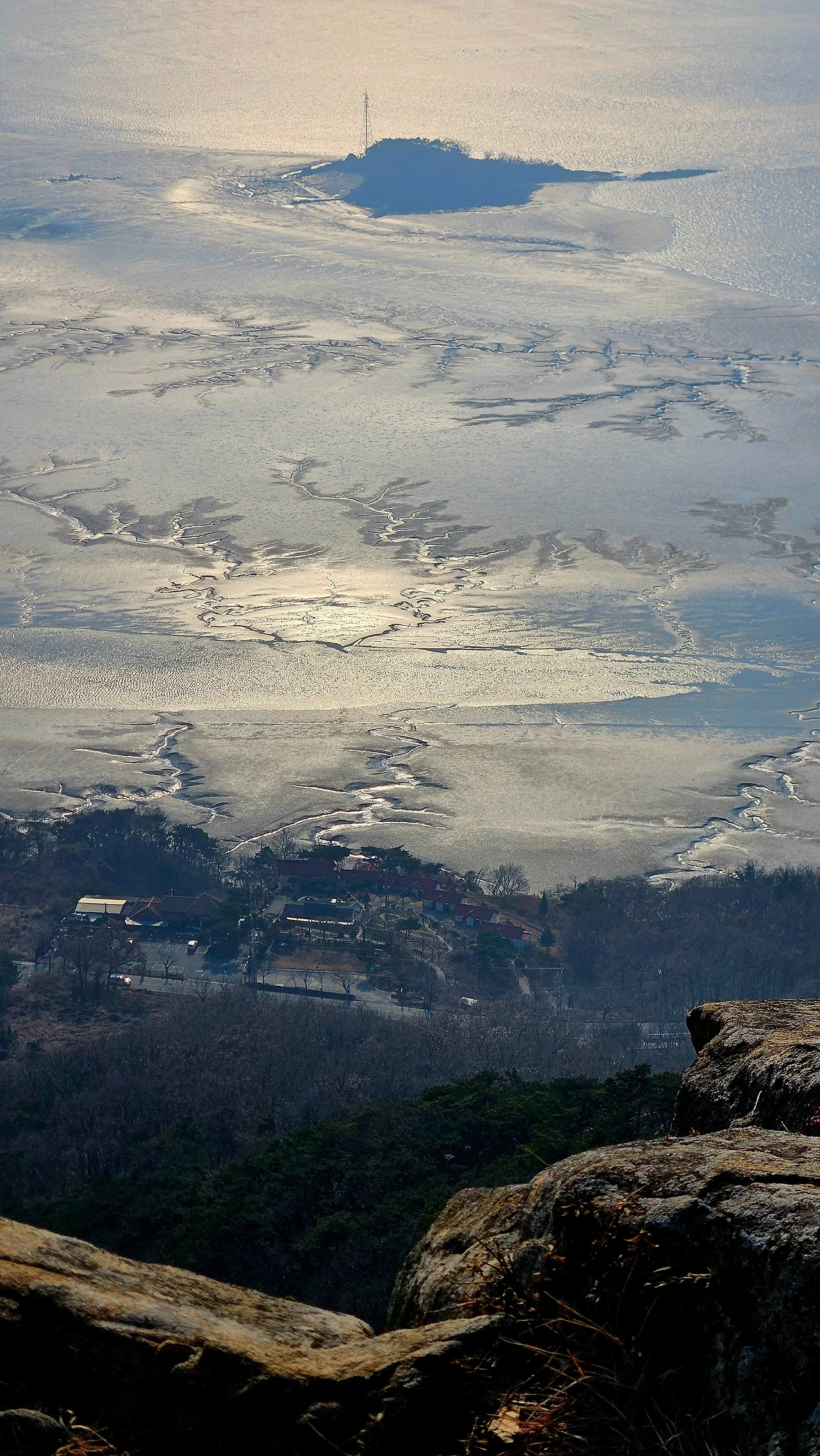 능선에서 서쪽 바다 쪽으로 돌출한 너럭바위 위에 둘러앉아 배낭에 챙겨온 음식을 나누어 들며 바다를 조망했다. 썰물로 멀리 물러난 해면 위에 반짝이는 아침 햇살과 부드러운 나신(裸身)을 드러낸 갯벌의 위에 드러난 오묘한 추상화 같은 형상이 신비롭다. 그 형상은 키 큰 전나무 같기도 하고, 우주탐사선이 보내온 어느 행성 표면의 영상을 보는 듯도 하다.
