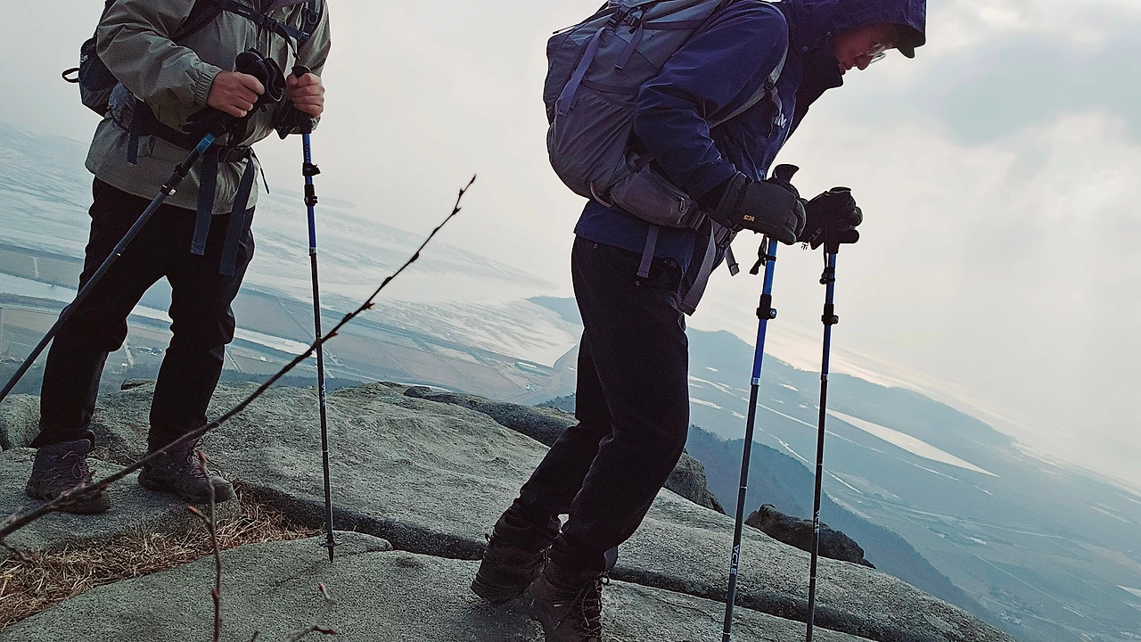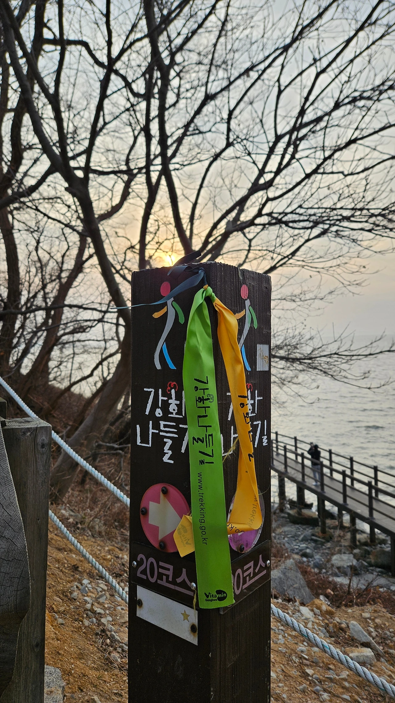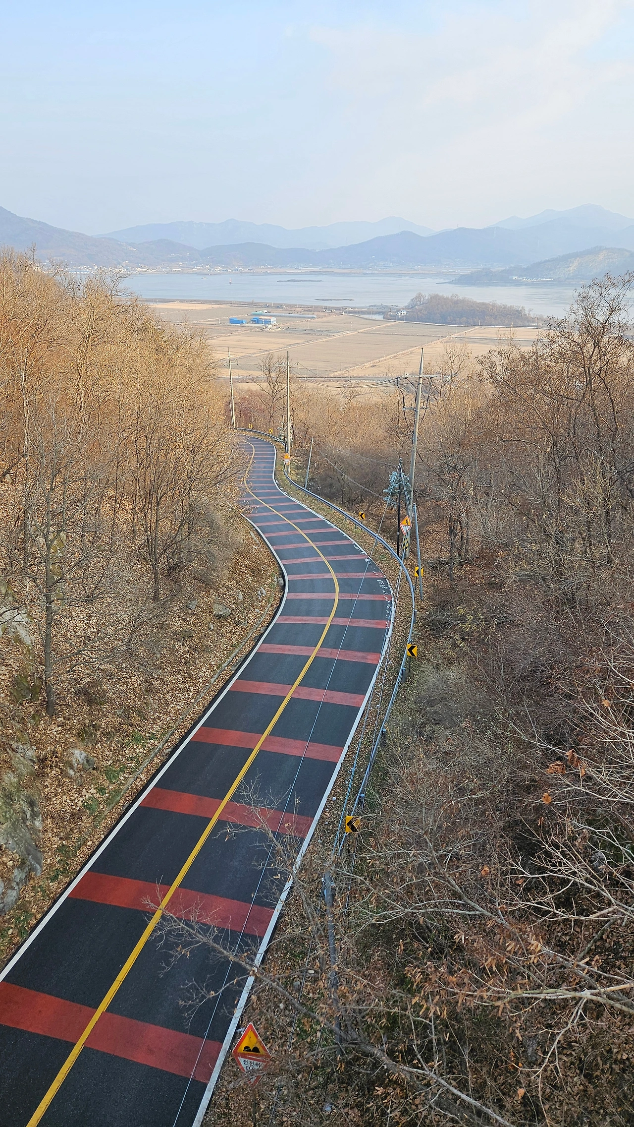 절고개를 지나고 어느새 해발 316m 상봉산 정상에 닿자, 서쪽 바다에서 더욱 세찬 바람이 몰아친다. 좁은 능선 한편에 서 있는 목책처럼 생긴 나무 기둥 정상 표지석에 동행과 함께 몸을 맞대고 서서 인증 사진을 한 장 남겼다. 시나브로 한가라지 고개가 1km 남짓 거리로 다가오며 산행이 종점으로 치달았다.