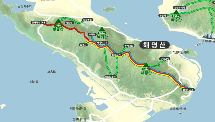 전득이 고갯마루 바로 아래 너른 주차장에 차를 세우고 산행을 시작했다. 산행 코스는 섬을 남북으로 가로지르는 해명산과 상봉산 줄기의 남쪽 끝 전득이 고개에서 해명산 정상, 방개 고개, 새가리 고개, 절 고개, 상봉산 정상을 차례로 거쳐 북쪽 끝 한가라지 고개로 내려서는 일직선의 대략 10km의 거리이다.