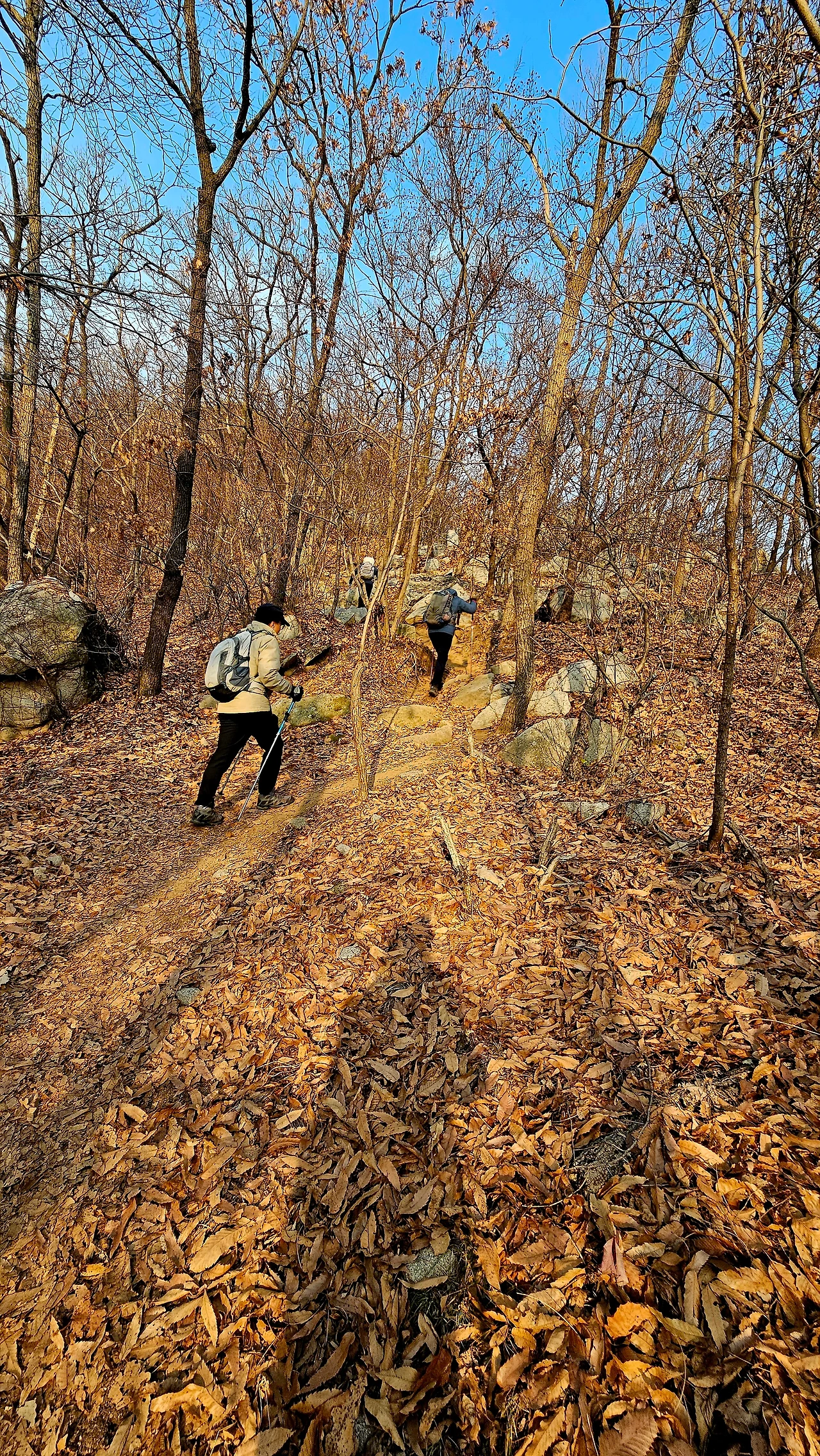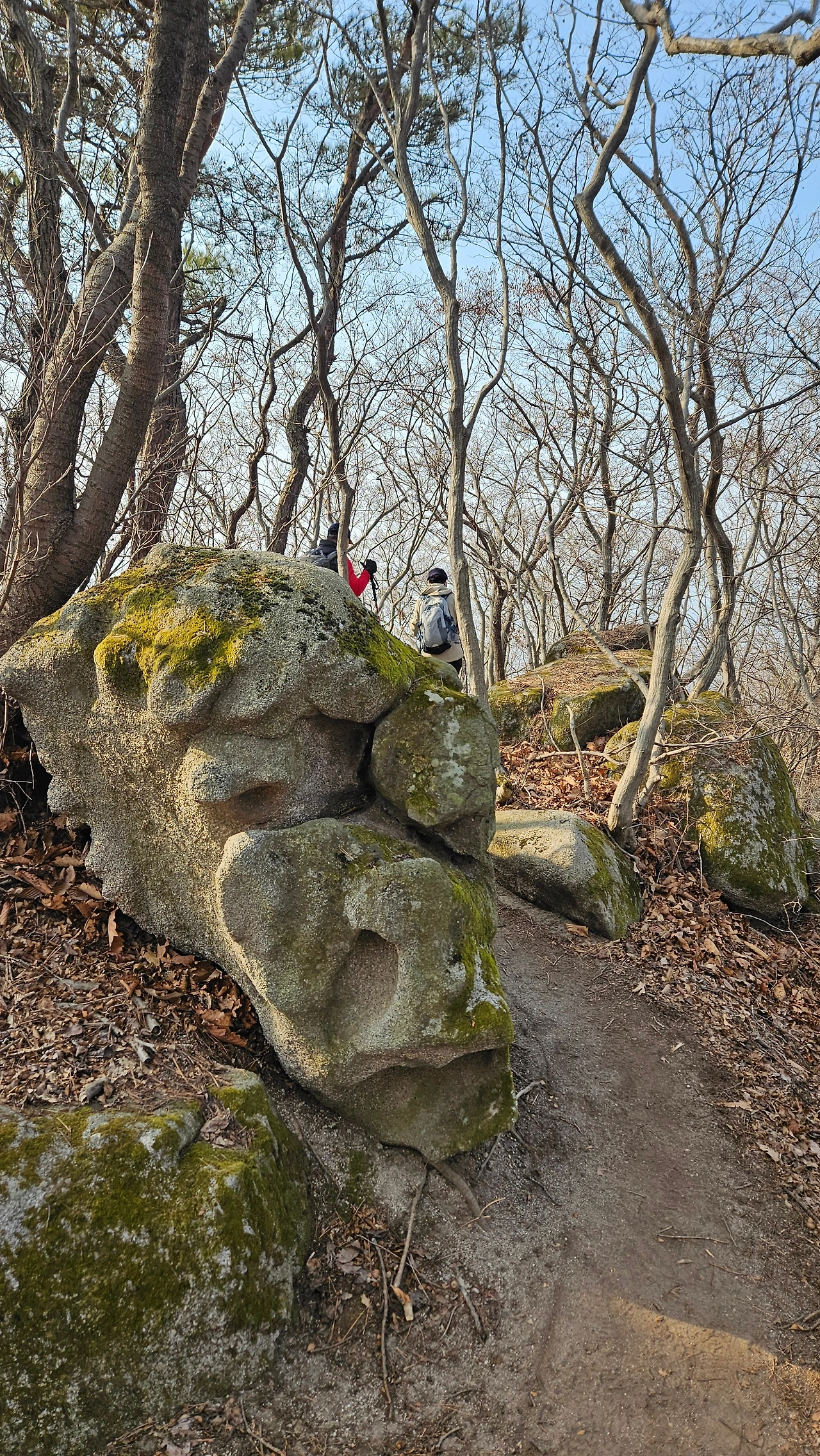 해명산 정상에서 각각 1.9km와 2.5km 지점에 있는 방개고개와 새가리고개를 향해 산행을 이어갔다. 평탄한 능선은 산행이라기보다 가볍게 산보하는 느낌이다. 능선길 곳곳에 기기묘묘한 모습의 바위들이 눈길을 잡곤 한다. 우리는 즉석에서 '햄버거 바위', '외계인 바위' 등 그 모습에 걸맞는 이름을 붙여보기도 한다.
