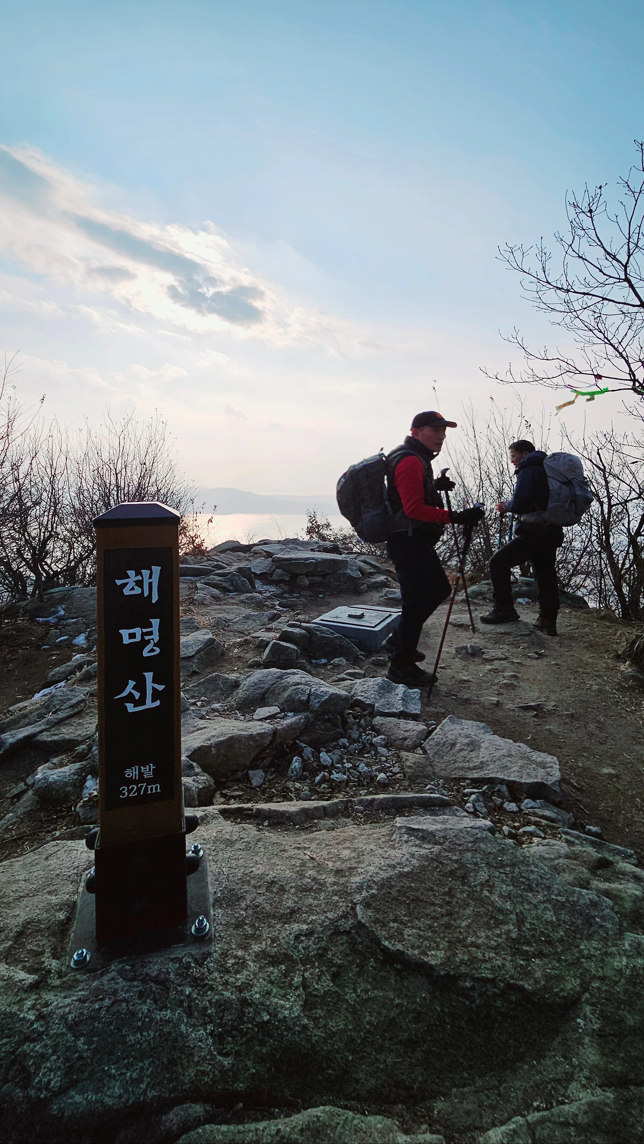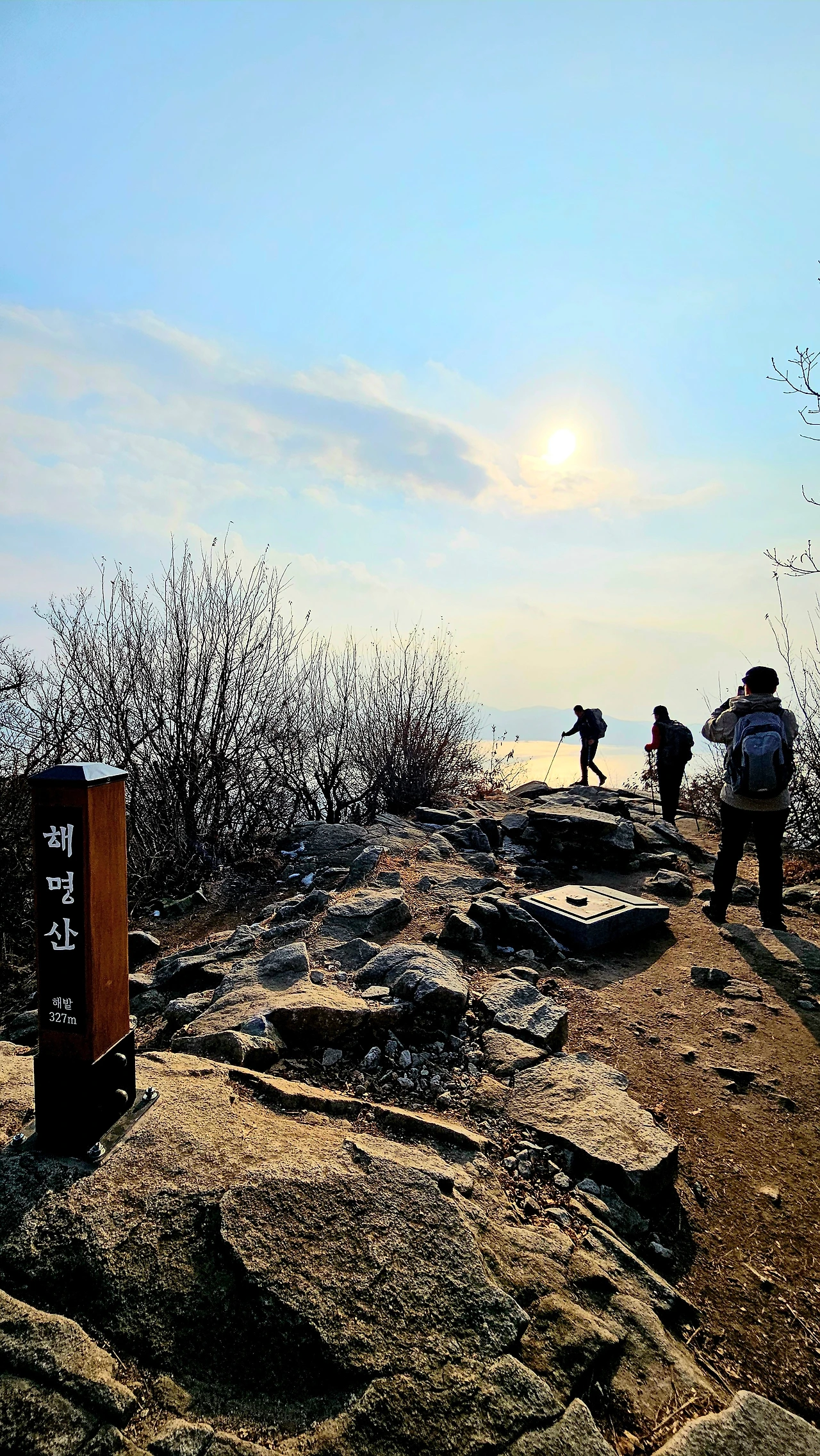 능선길 등로는 수월하여 등산 초보자라도 어려움 없이 걷기에 딱 좋다. 햇볕이 들지 않은 음지의 바위에는 언제인지 내린 것인지 잔설이 보이기도 한다. 우측 멀리 섬과 섬을 잇는 반듯한 석모대교가 눈에 들어온다. 전득이고개에서 해발 327m 해명산 정상까지는 1.8km로 금세 닿았다. 능선 한가운데 서 있는 이정표저럼 생긴 허리 높이 사각 나무 기둥이 해명산 정상임을 알린다.