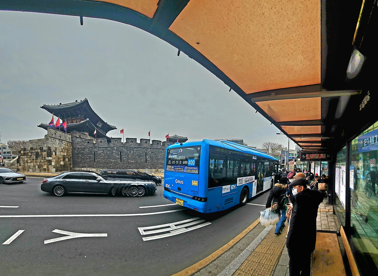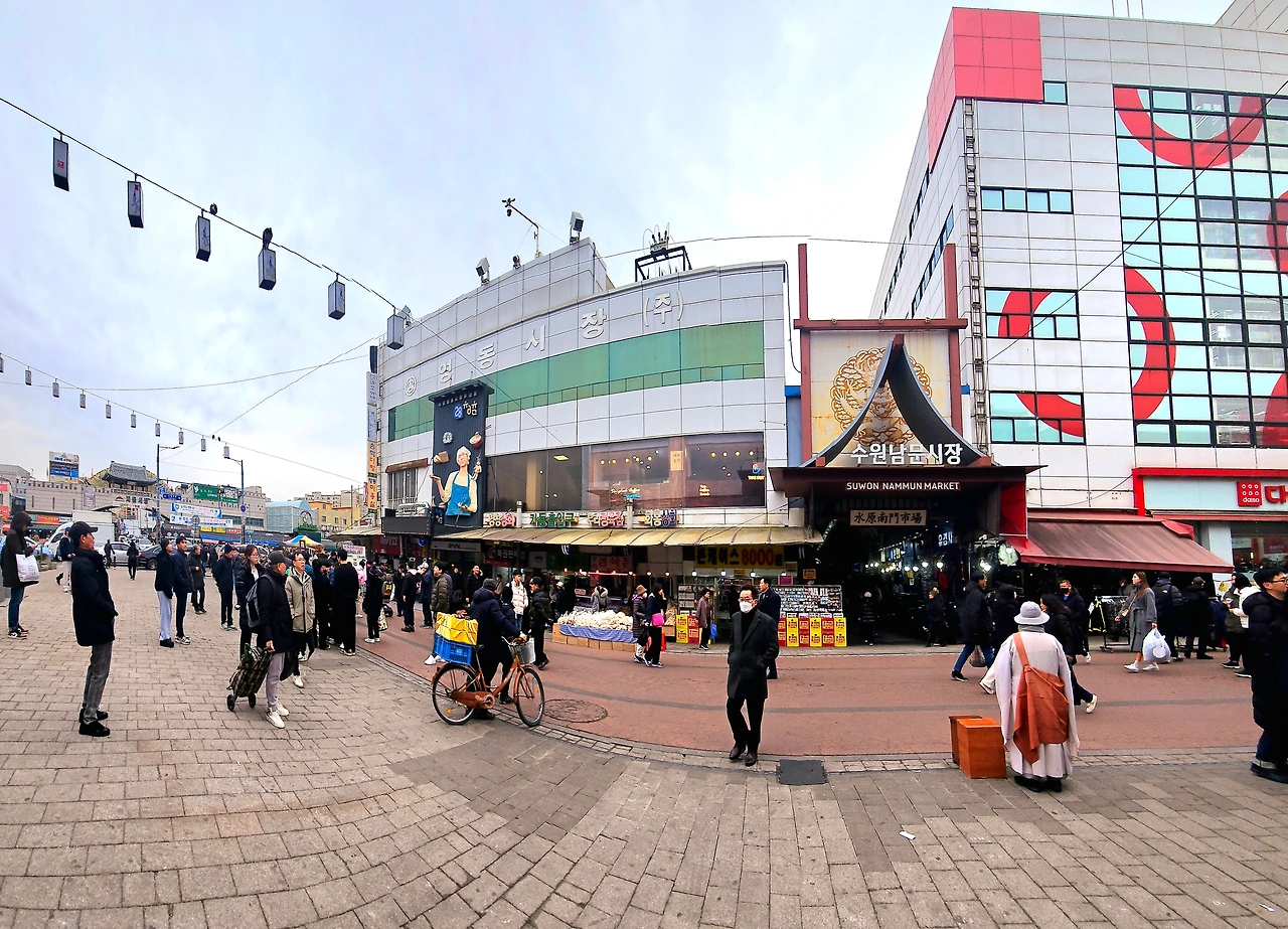 흰색 깃발은 어느새 남쪽을 상징하는 붉은색으로 바뀌어 있다. 항아리 모양의 옹성에 둘러싸인 팔달문 둘레로 차량이 돌아 지나고, 버스정류장엔 주변 시장에서 장을 보러 다녀가는 사람들로 북적인다. 문화재로 지정된 까닭인지 팔달문 주변은 예전과 크게 달라진 것이 없는 모습이다. 많은 인파로 붐비는 팔달문 동남쪽 팔달문시장과 남문시장 부근은 설 대목을 맞아 생기가 넘쳐 보인다.