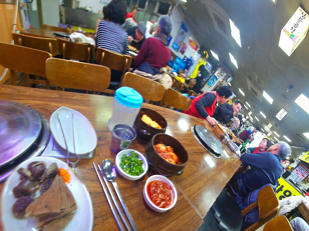 끓이고 있는 순댓국에 앞서 순대와 간 한 접시, 깍두기와 김치가 각각 담긴 작은 단지 둘, 새우젓이 담긴 종지 하나를 먼저 내온다. 뒤이어 나온 순대와 돼지 부속물이 듬뿍 담긴 팔팔 끓인 순댓국, 그 비주얼과 맛이 먼 세월의 간격을 뛰어넘어 아른거리는 옛 기억을 소환한다. 먼저 일어서며 손인사를 하는 노 부부들에게 인사를 보내고, 미션이라도 클리어해야 하는 양, 식탁 위의 음식을 말끔히 비우고 터질 듯 부른 배를 문지르며 자리에서 일어섰다.